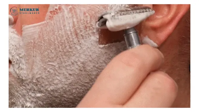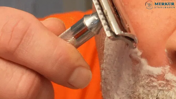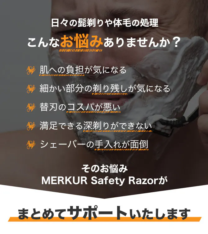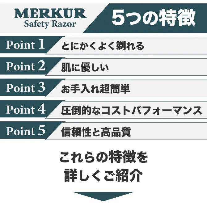 刃の手前に凹凸型のMERKURらしい丸み設計を施す事で皮膚の下ではなく皮膚レベルでカットし、皮膚を傷つけづらいのにしっかり深剃りできるという理想の剃り心地を味わうことを可能にしています。