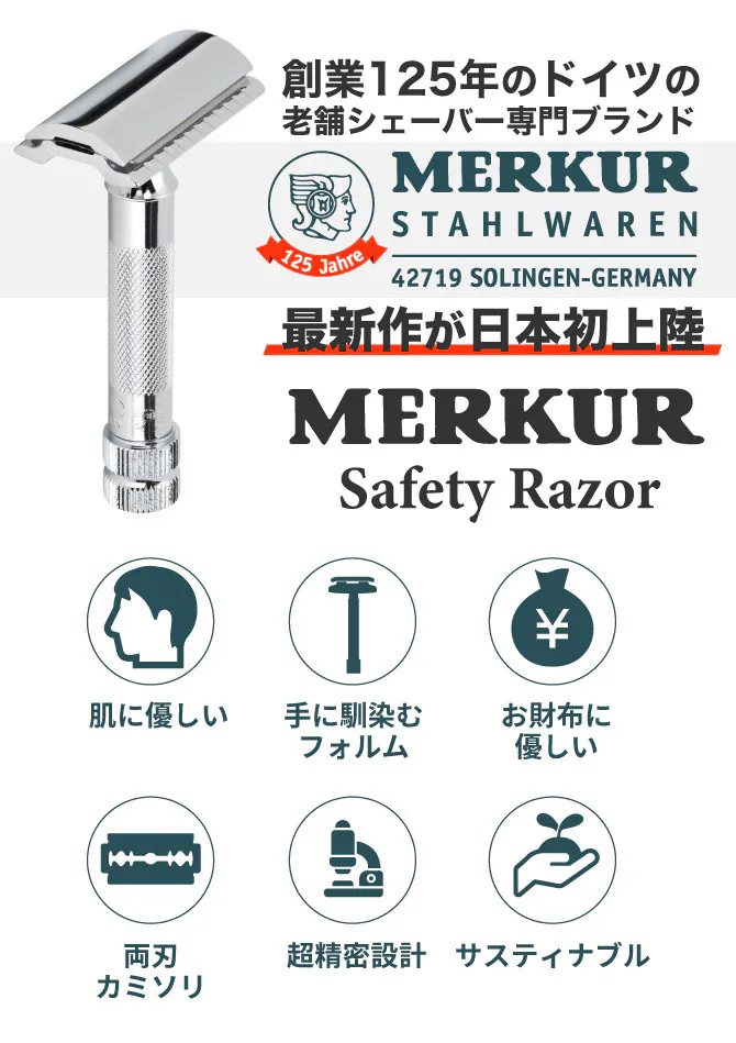 メルクールは1896年にエミール・ヘルメス・メルクールとしてドイツに創業した、安全カミソリのパイオニアブランドです。 創業以来、常に安全性が高いカミソリの改善に情熱を注いできました。