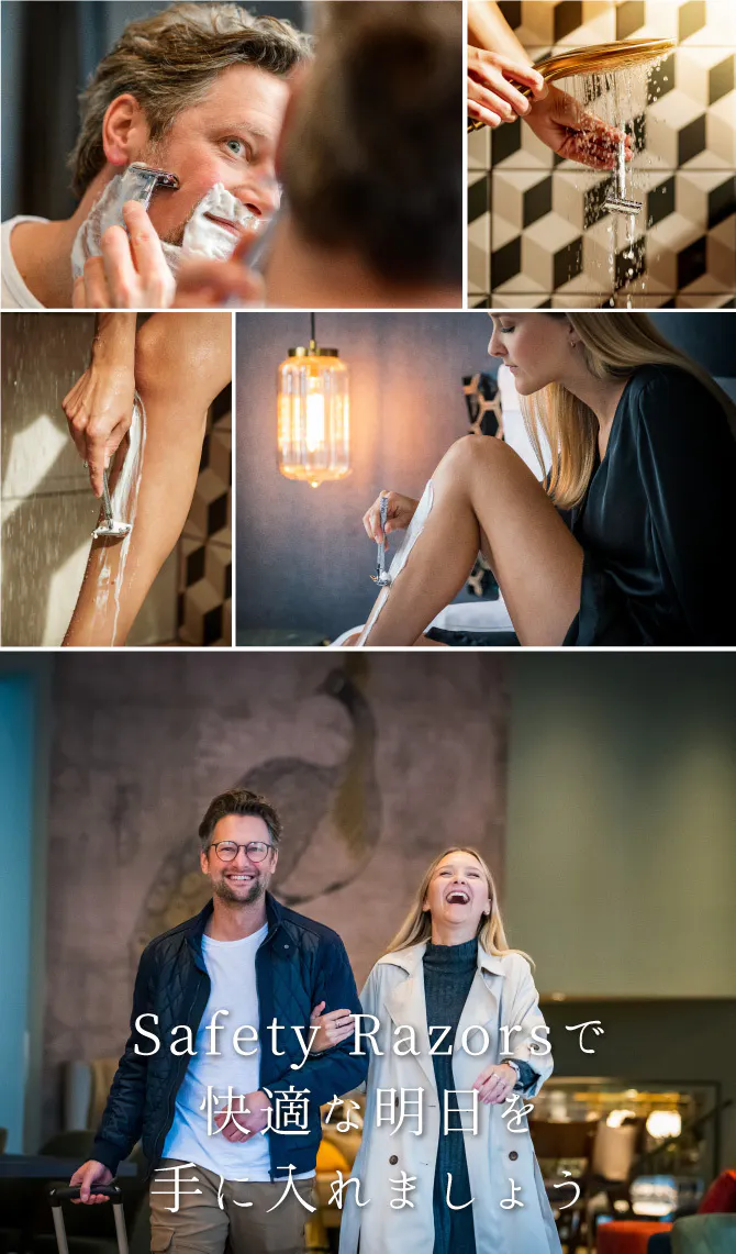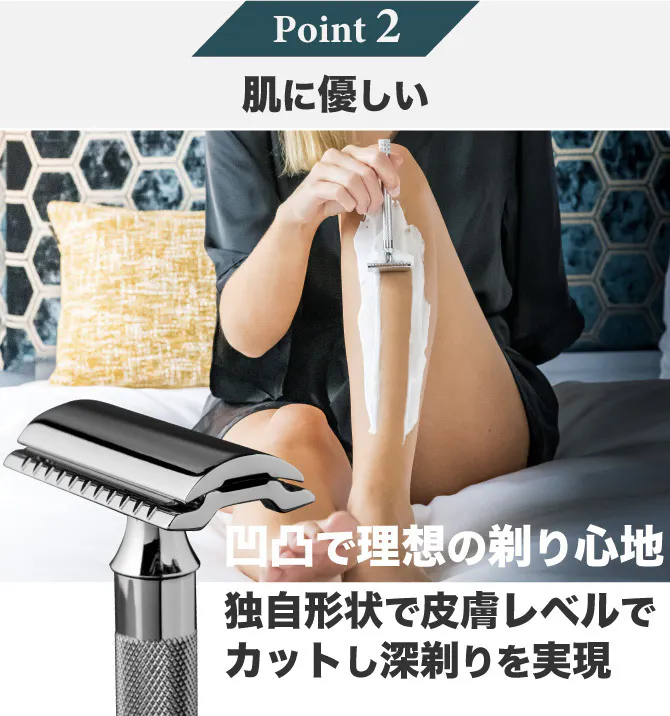 マイルドな剃り心地と、より深剃りを求めたい方に向けた爽快な剃り心地、安全カミソリの可能性を極めるべく改良を重ねました。またヘッドの形状を再設計することでより滑らかで安全性も高いシェービングを実現し改良した重量で滑らせ肌に密着したシェービングの最適化を図っています。