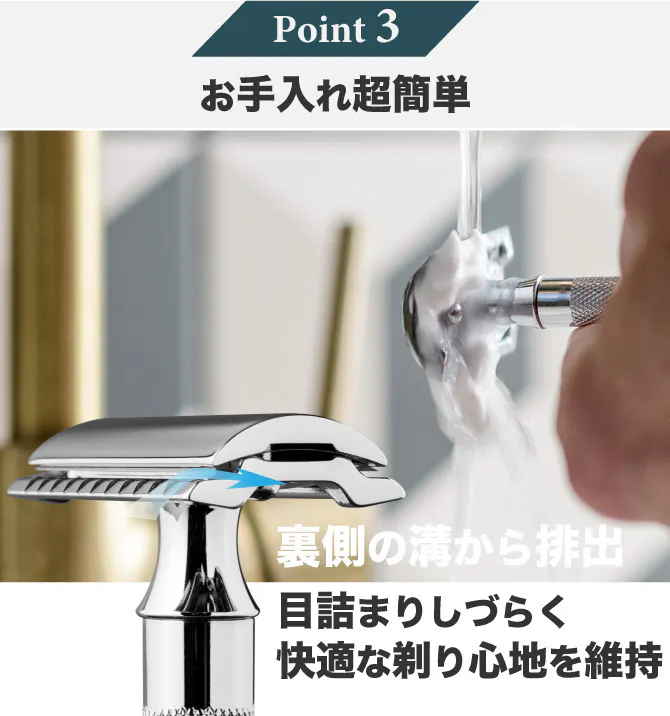 A:普段のお手入れは非常に簡単で、剃り終わったら軽く水洗いして乾かしておくだけです。また刃を固定しているヘッド部分をやや緩め、隙間の汚れも洗い流すことができますので手間もかかりません。お風呂場での保管はお勧めしません。耐久性はあるものの、替刃を交換するタイミングで分解洗浄やブラシを利用してメンテナンスいただければ経年劣化も防げます。経済的・環境にも配慮して、長くご愛顧いただける一生モノを目指しております。