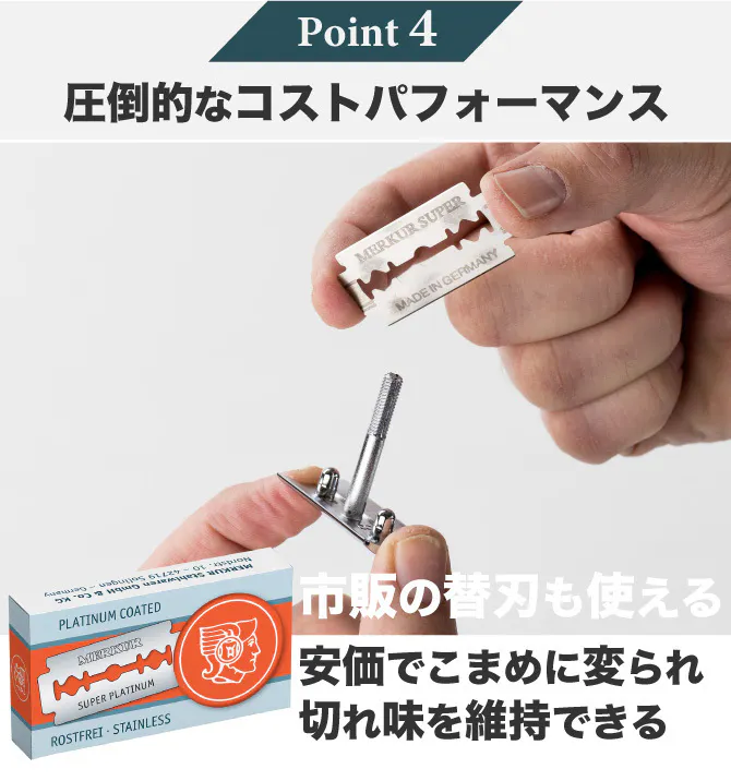 MERKUR Safety Razorは市販の安価な両刃を使用できるので、1枚約50円(もっと安いものもあります。)で1週間に一度刃を変えるとしても、替刃のランニングコストは一日約7円くらいです。長期的にみていただくと、かなりお得なのがご理解いただけるかと思います。