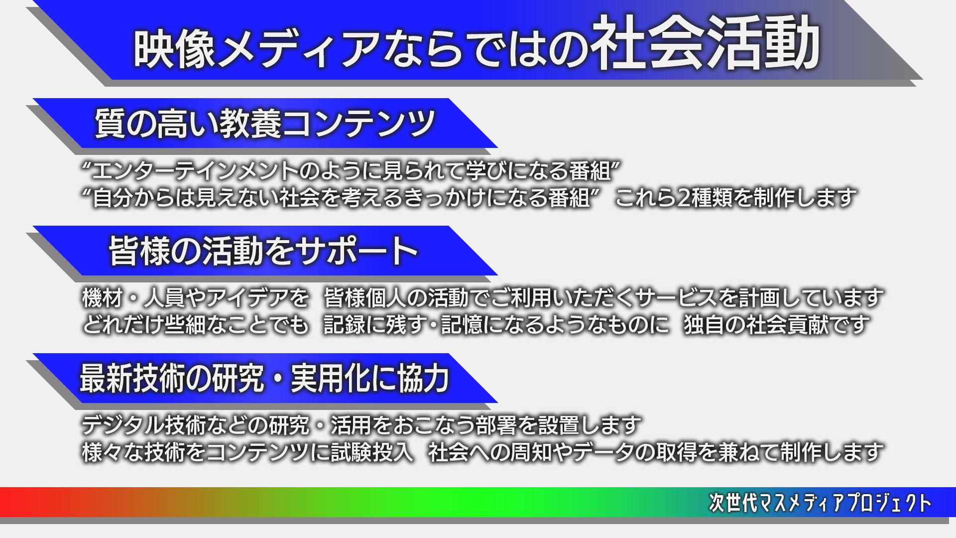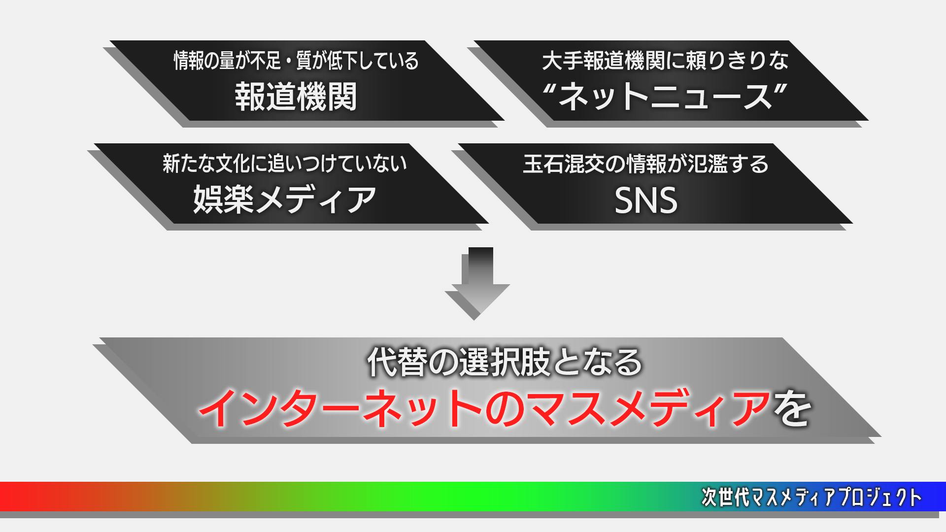 そこで、情報社会にまつわる問題を解決する一助になるよう、インターネットで展開する完全に独立した映像メディアを、設立したいと考えております。