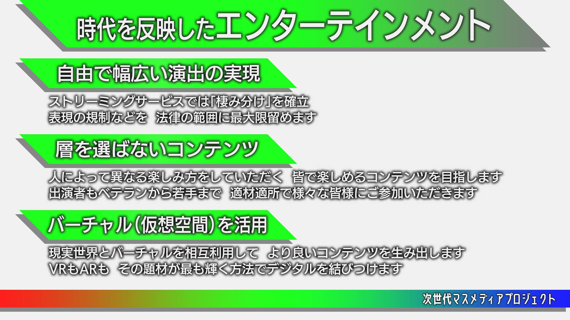 そして、その時代の先進的な技術を理解している企業であり続けます。エンターテインメントを扱う存在であるこのメディアが、最新技術を積極的にコンテンツに利用することで、社会へ浸透させるとともに、その技術の進歩につながる参考資料を作ります。