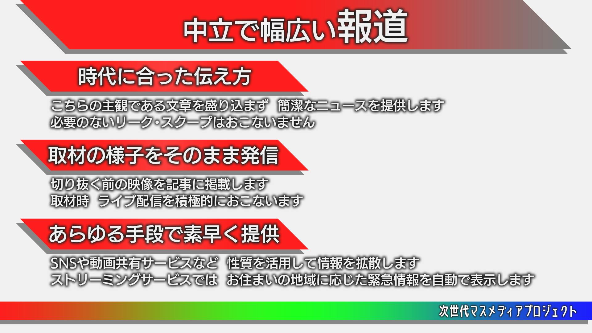 今の社会で求められている報道は、「世の中に対する考え方を示す」ことではなく「独自に考えをもつための材料を提供する」ことだと考えました。そこで、事実や“根拠のある可能性”のみを、その物事の全体を理解しやすいようなまとめ方で伝えます。