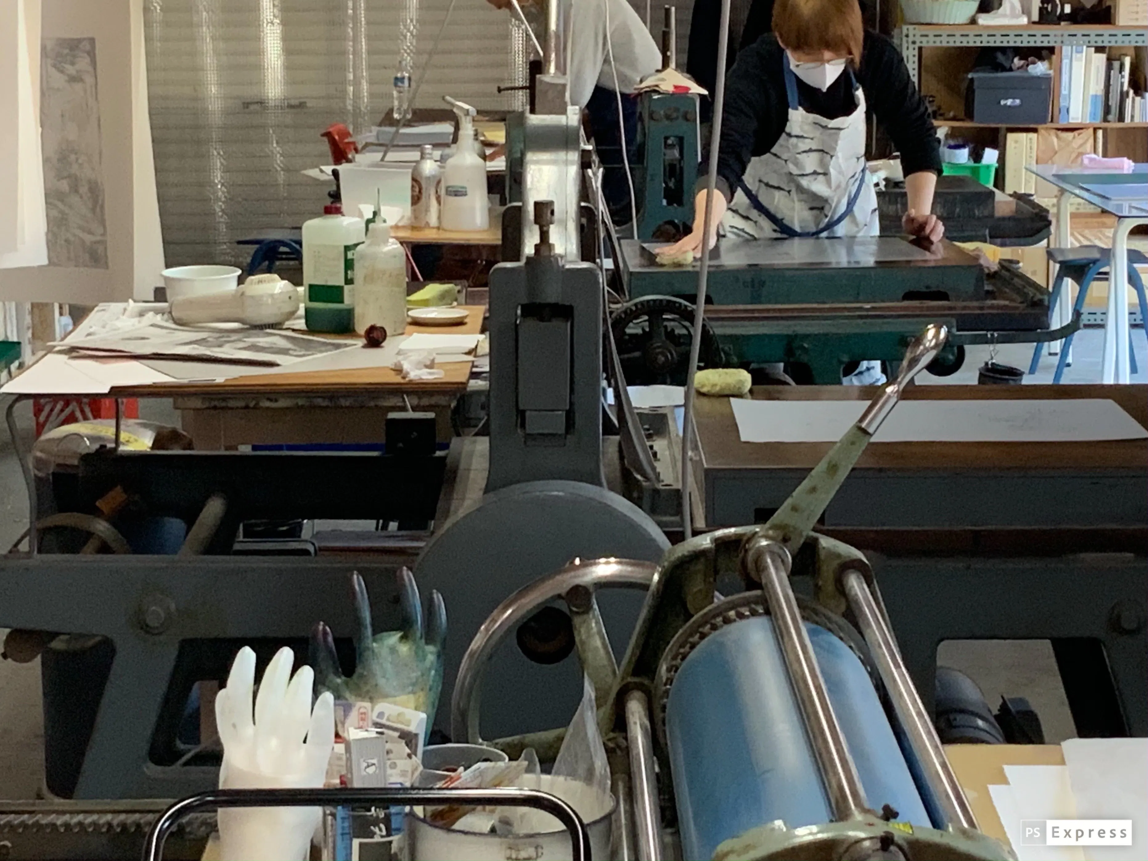 大学勤務時代を通じて、様々な作家や印刷業者から使用されなくなったプレス機や石版石を引き取り、これから作品を作りたいという若い後輩たちに譲るなど、廃棄を防ぐ活動をしてきました。ドイツから輸入したゾルンホーフェン産の石版石灰石なども含め、現在工房で稼働しているプレス機の何台かは、同じように捨てられる運命にあったものをタイミングよく救うことができたものです。