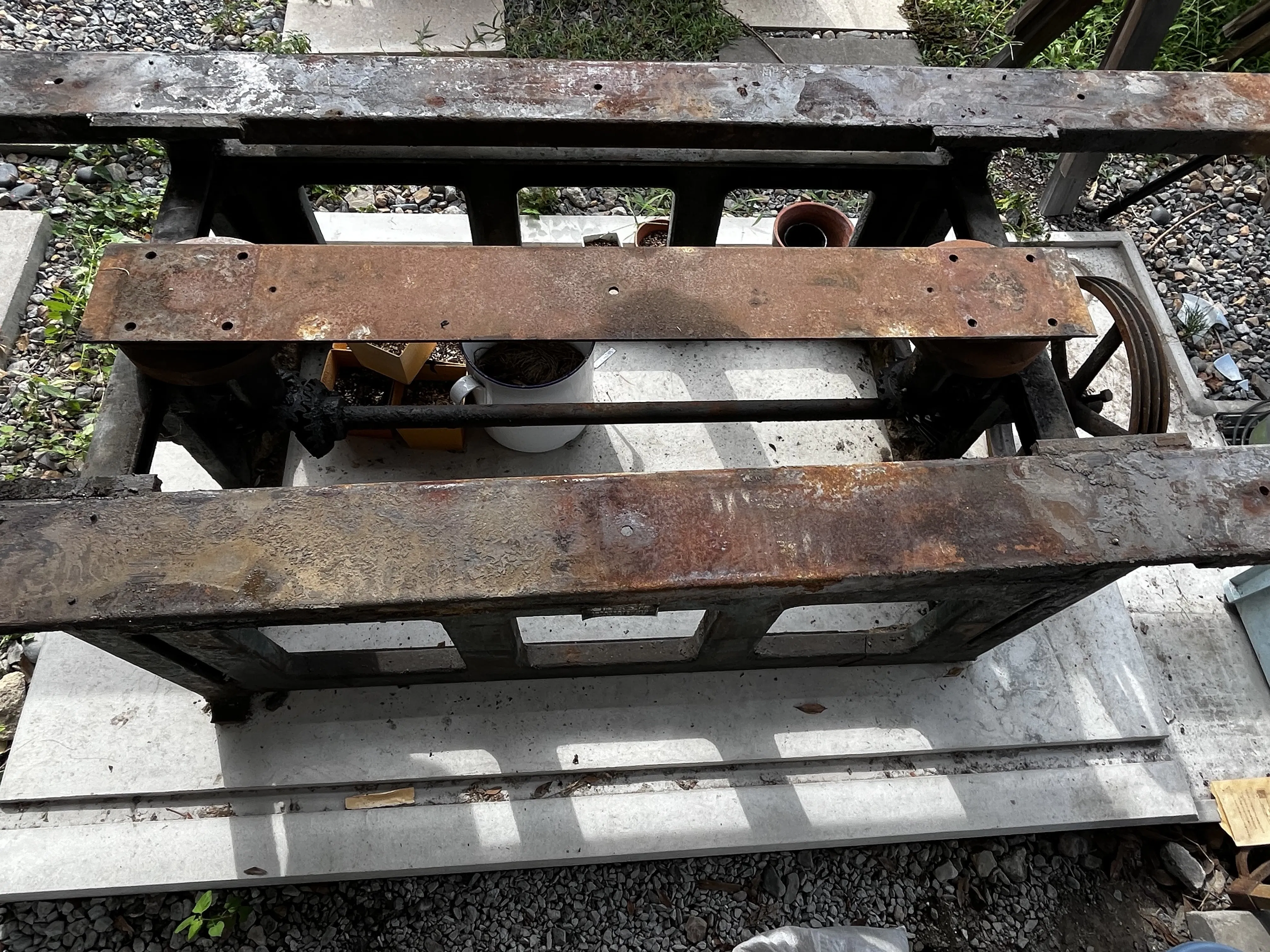 当工房では、先年廃業になった東大阪のクラタ商店さんで長年使われてきた、リトグラフ用アルミ版を製造する研磨機の心臓部分を保存しています。これ自体貴重なものですが、現在はメインページの動画などをご覧になればおわかりになるとおり、先史時代の生き物の化石のような骨組みを残すのみで、稼働はできません。