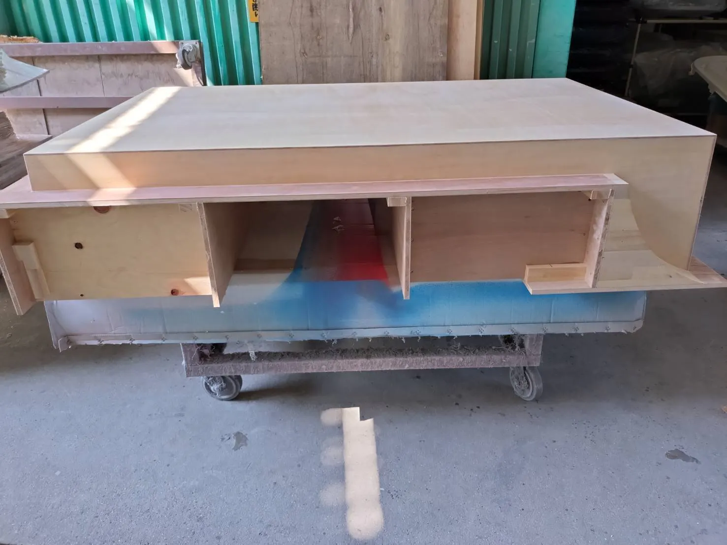 たった今、広島で制作してもらっている研磨槽(FRP製、工業用ゴムシート内張)の原型製作が進んでいるとの連絡がありました木製のトレイの片側が研磨槽を傾けた時、内容物がこぼれ出ないように縁が高くなっているもので、一番上になっている部分が、研磨槽のだいたい内側の形になります。ひっくり返したところを想像してみてください