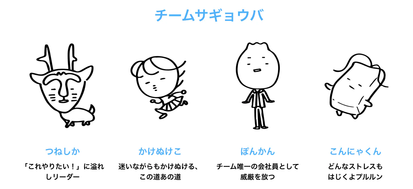 起業家つねしか、会社員ぽんかん、フリーランスかけぬけこ、こんにゃくん。