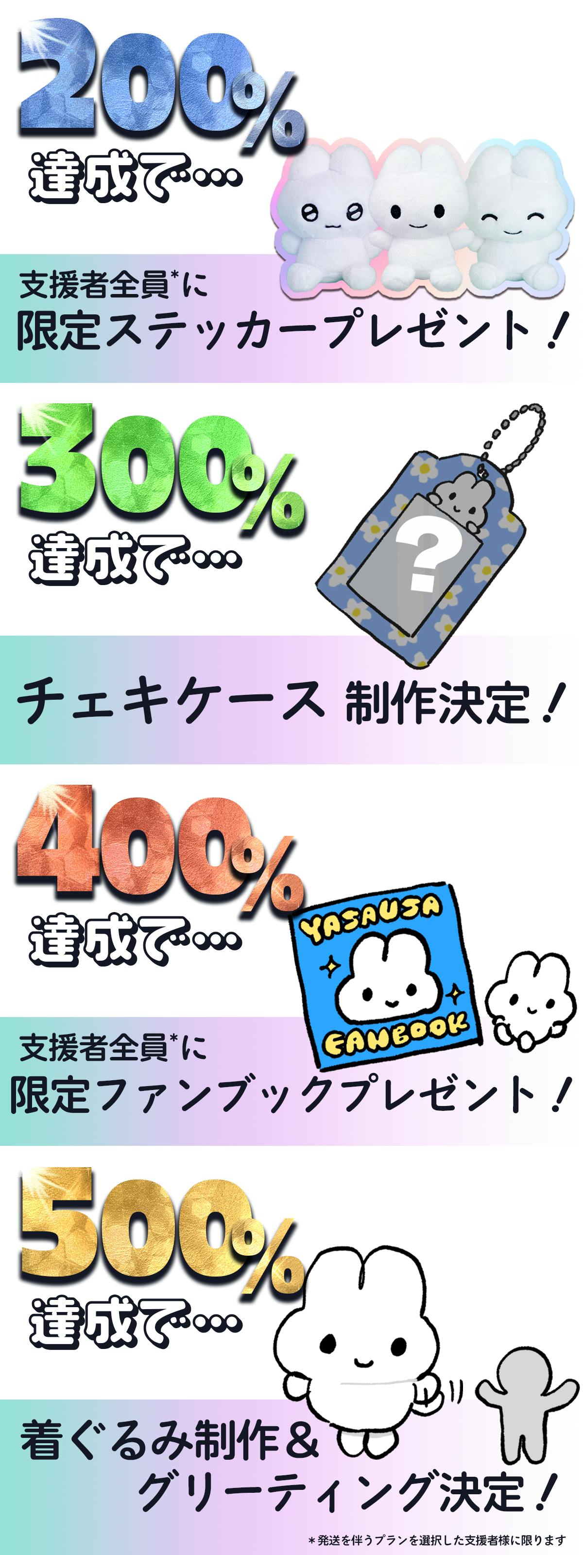 これまで数多くのクラウドファンディングを実施し、成功へと導いてくださった皆様、また最近やさうさちゃんを応援し始めた方、どうぞご支援のほどよろしくお願いいたします。