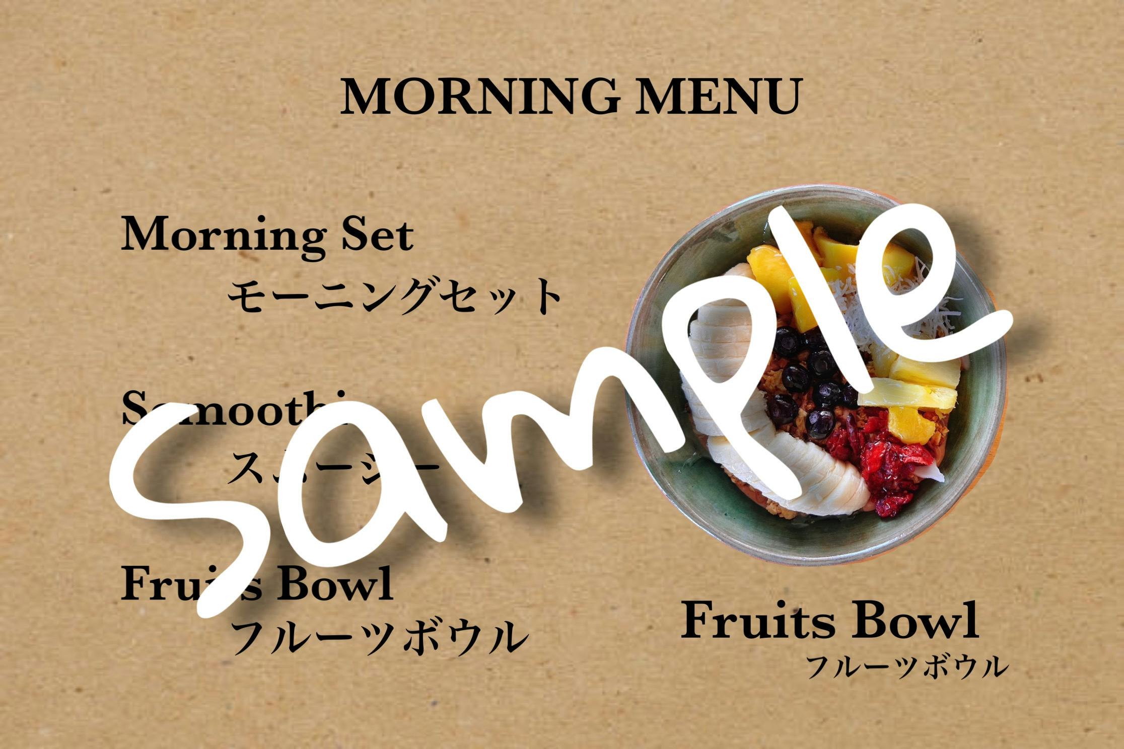 例:モーニングセット(パン)、スムージー、フルーツボウル