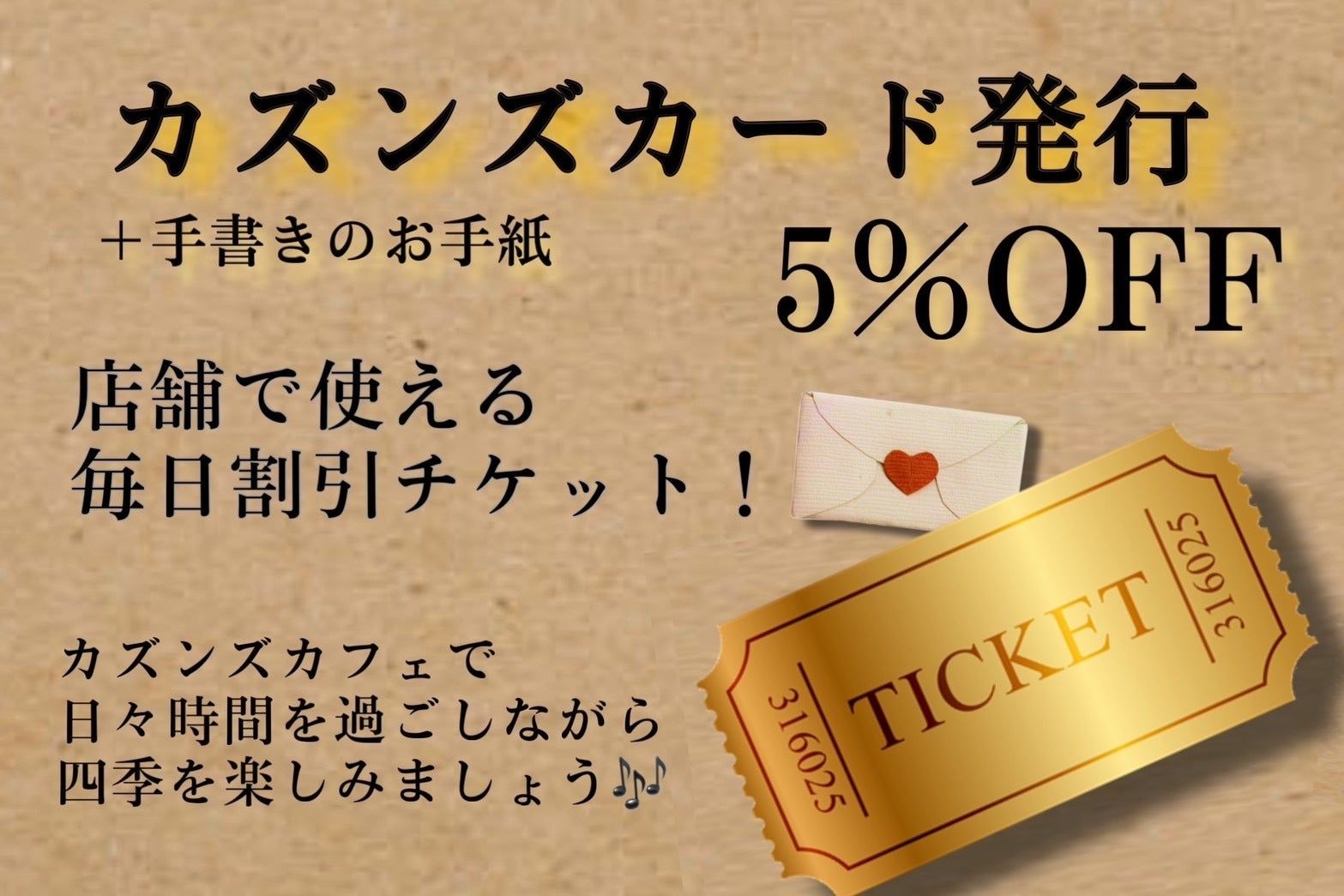 オープンから1年間、毎日使える5%OFFのカード(限定5名様)を発行致します。