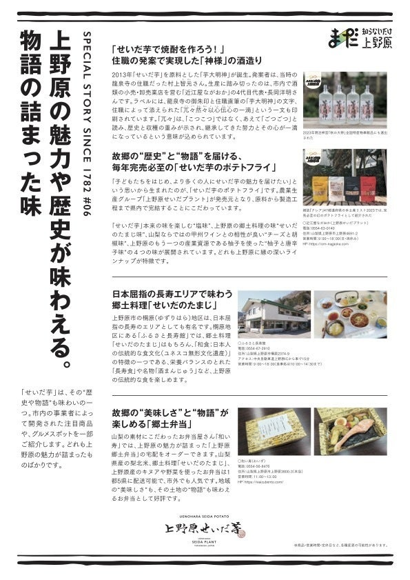 上野原市の魅力が詰まった味。それが上野原市の特産品!本格焼酎「芋大明神」以外にも、上野原市には「せいだ芋」を通して地域の魅力を発信する多様な商品が多数存在します。歴史も伝統も一夜では、決して創り上げられない希少価値の高いもの。私たちが大切に保護し、未来に繋ぐ様々な「美味しさ」もご堪能ください。