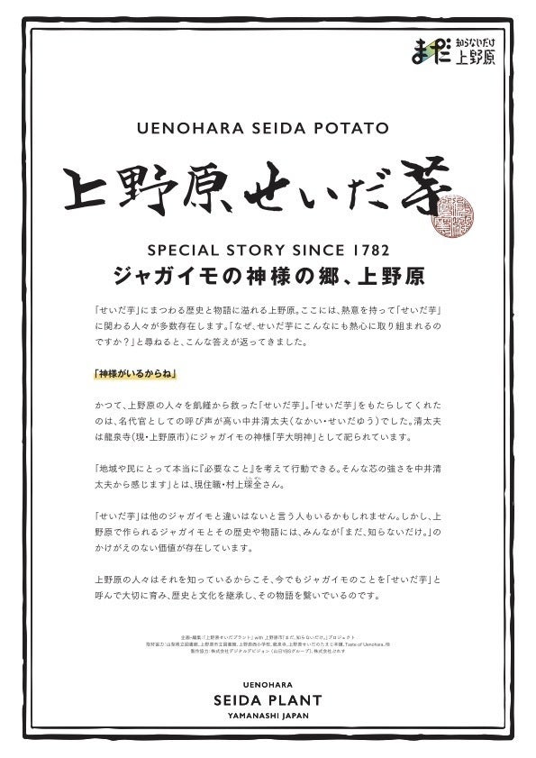 「せいだ芋」の栽培促進と伝承活動に取り組む「上野原せいだプラント」が、上野原市と共同で製作した「上野原せいだ芋物語」を通して、江戸時代(1782年)から続くこの物語の序章をご紹介させてください。