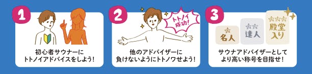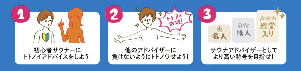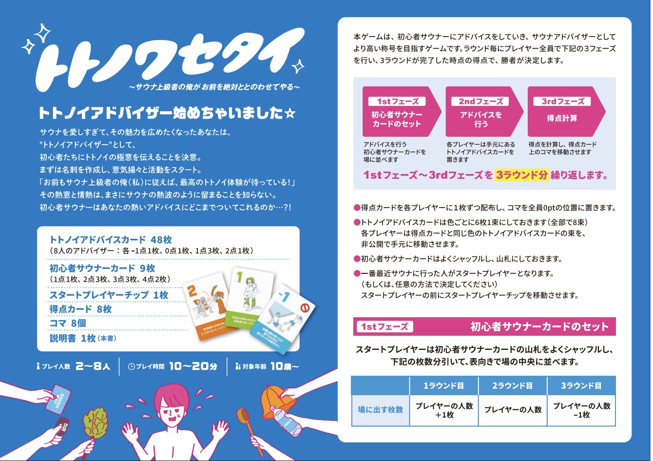 「トトノワセタイ」は、各プレイヤーが、サウナアドバイザーとして、初心者サウナーに、トトノイアドバイス (トトノイの極意を伝授)し、トトノわせることで、サウナアドバイザーとしてより高い称号を目指すゲームです。