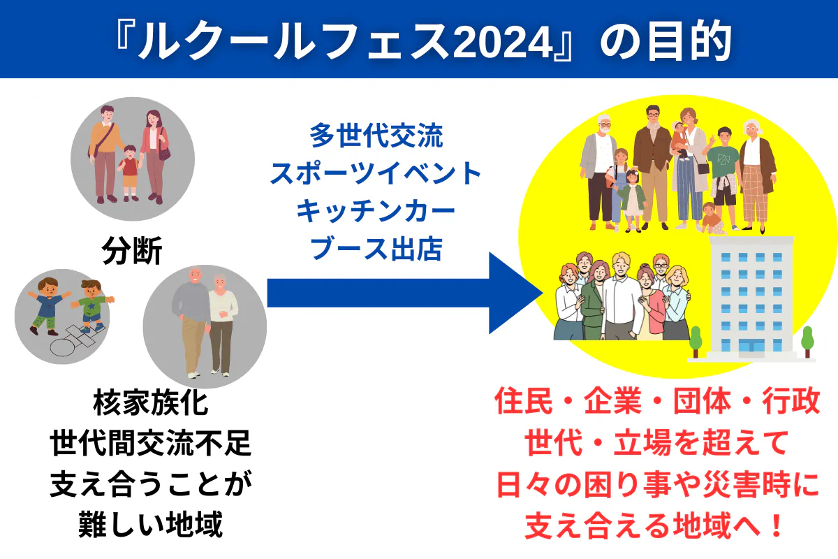 今回のクラウドファンディングの目的は、防災の2つ目の「多世代のつながりづくり」となります。そこで多世代交流スポーツイベント「ルクールフェス2024」を企画し、プロジェクトを立ち上げました!