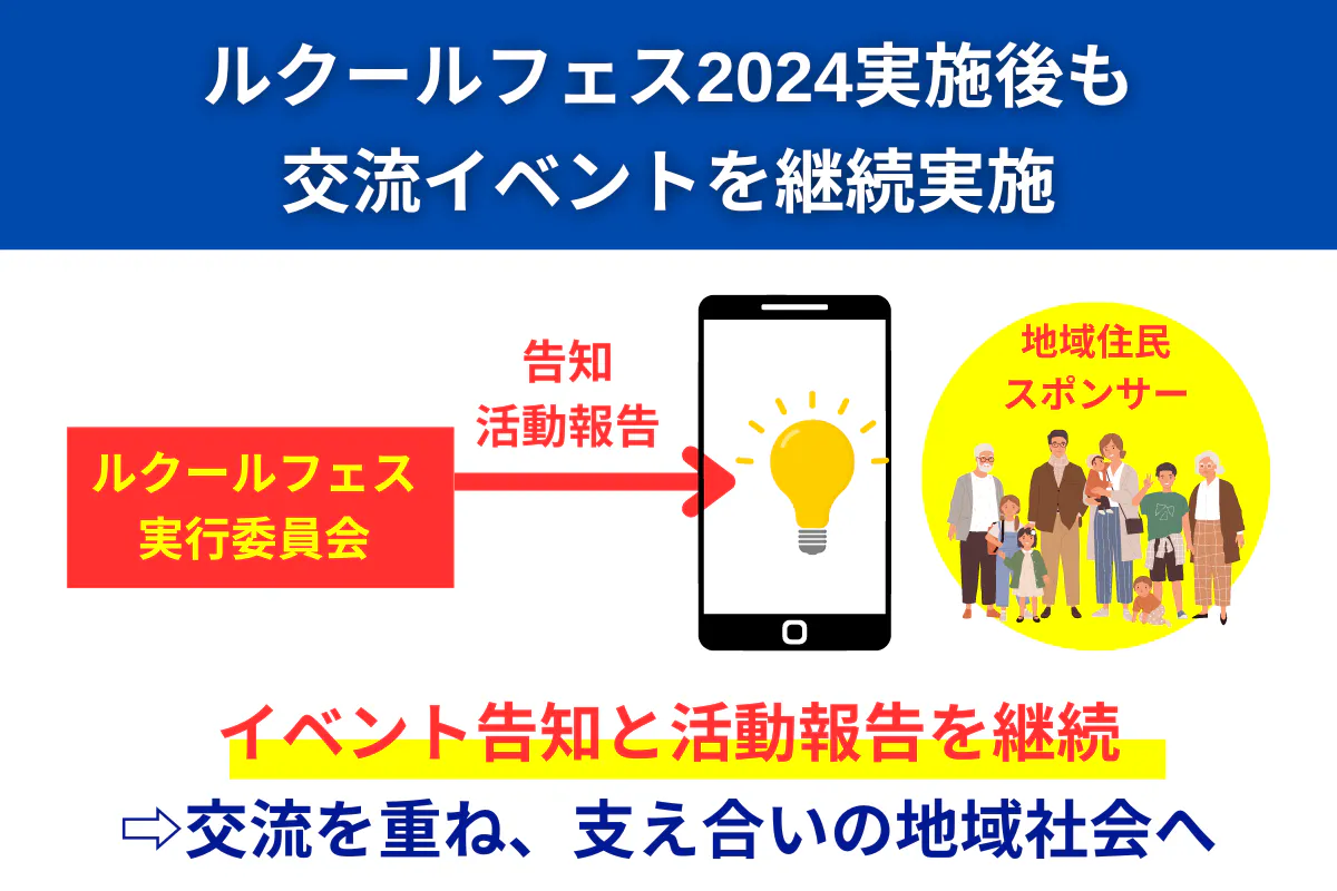具体的な連絡手段としては、ルクールフェスの参加者に「LINEアカウント」や、「みまもりあいアプリ」をスマートフォンにインストールしていただくように案内いたします。これを入れておいていただくと、イベントの告知・活動報告を継続でき、つながりを持続・拡大していくことができます。