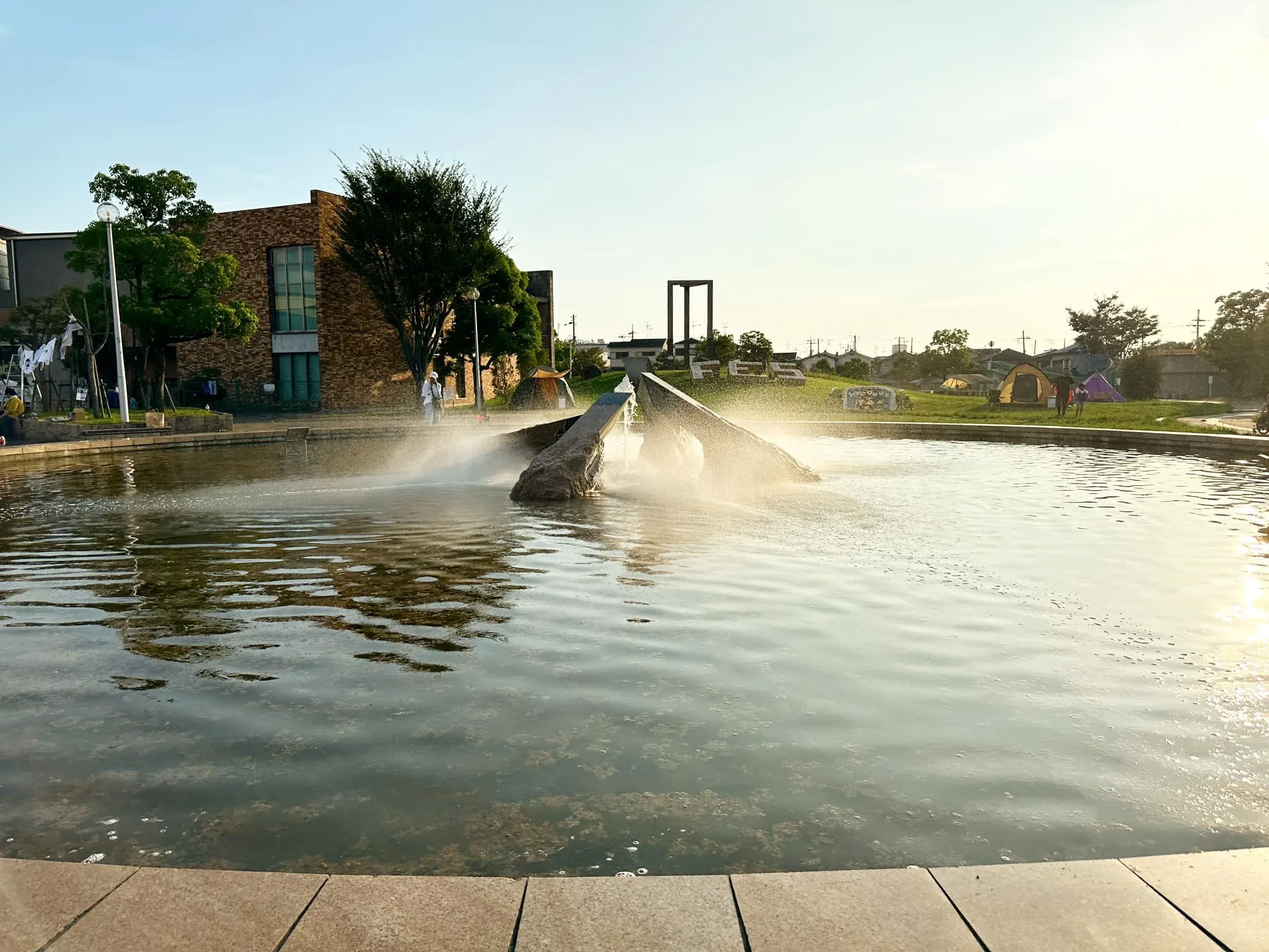 実は、egaoプロジェクトのメンバーの皆が、長い間可動していなかった公園の噴水を朝から炎天下の中、苔や泥を掃除してくれたことで、噴水の水がミストシャワーになり、フェス一体は、涼しげな風に包まれていました。