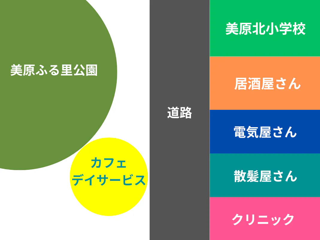 具体的にいうと、デイサービス・カフェの近隣のお店や学校などの位置は下の図のようになっています。