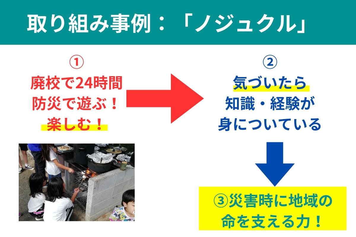 発足して10年以上になる任意団体「egaoプロジェクト」では、「ノジュクル」という【廃校を借りて防災を学びながら24時間過ごすプログラム】があるのですが、「遊んで楽しんでいたら防災の知識・経験が身についていた」という人を生み出す取り組みも行っております。