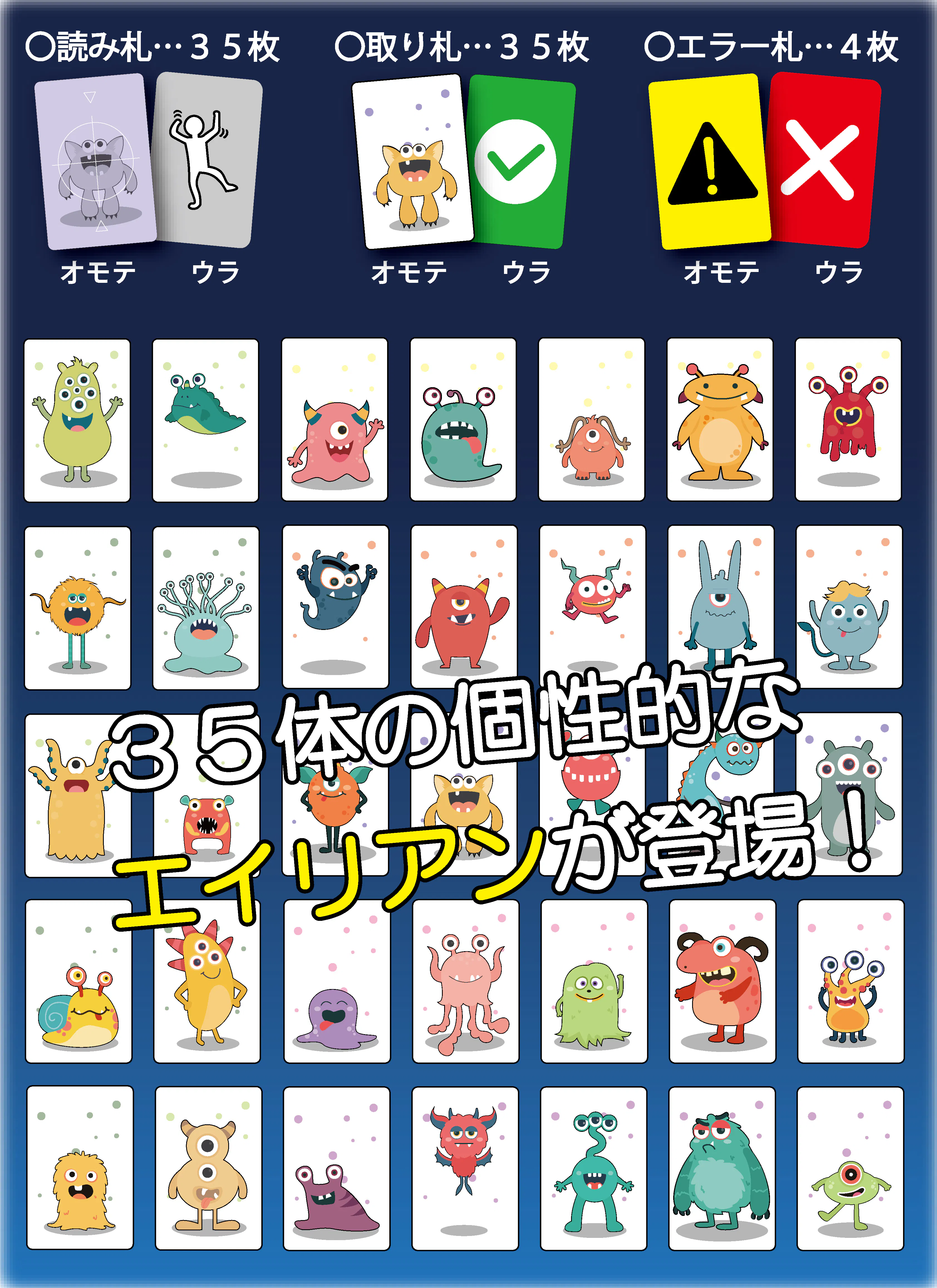 合計74枚のカードに、個性的な35体のエイリアンたちが登場します。駒やチップはないので誤飲の心配もなく、準備や片付けがとってもかんたんです。