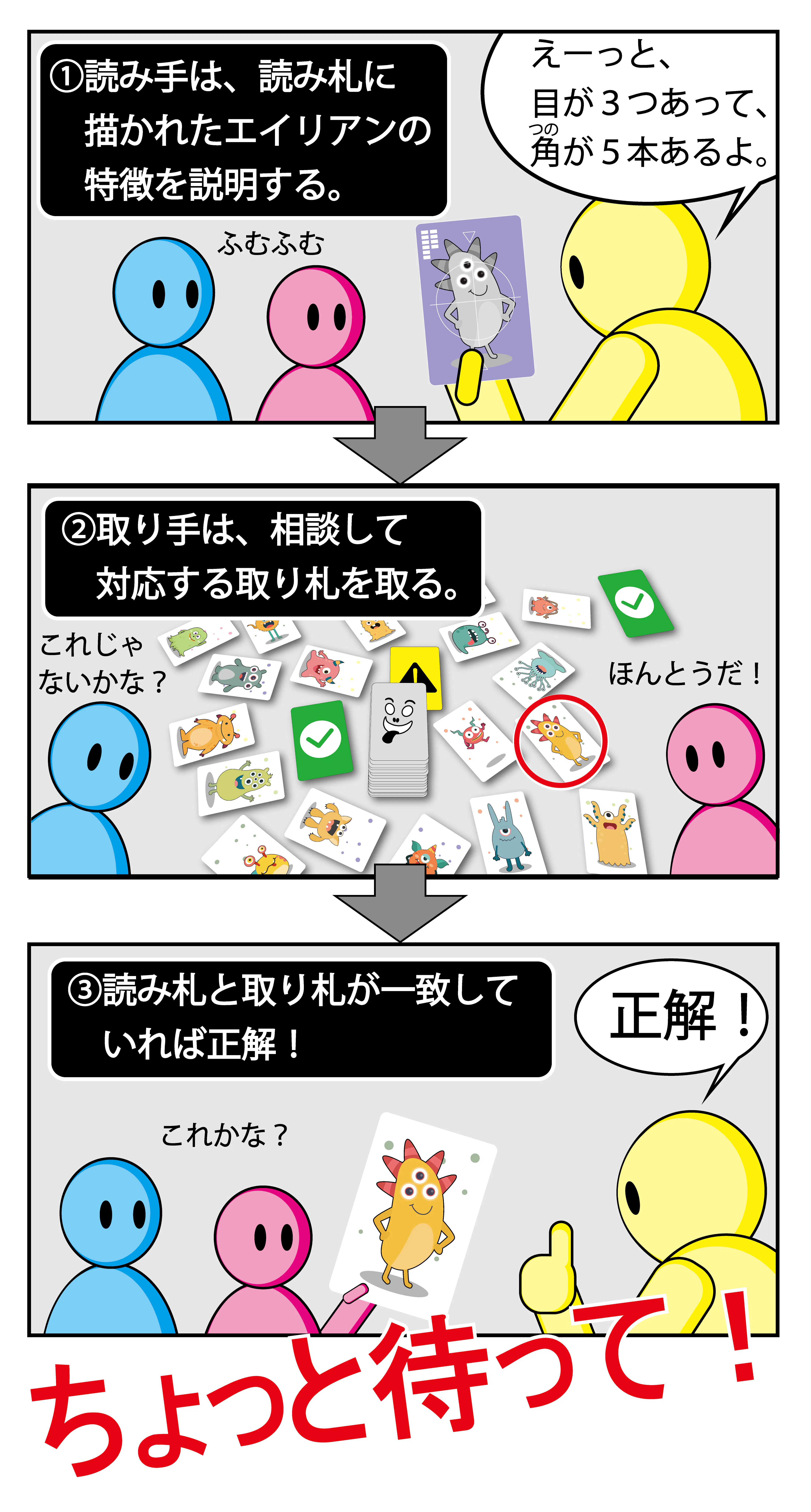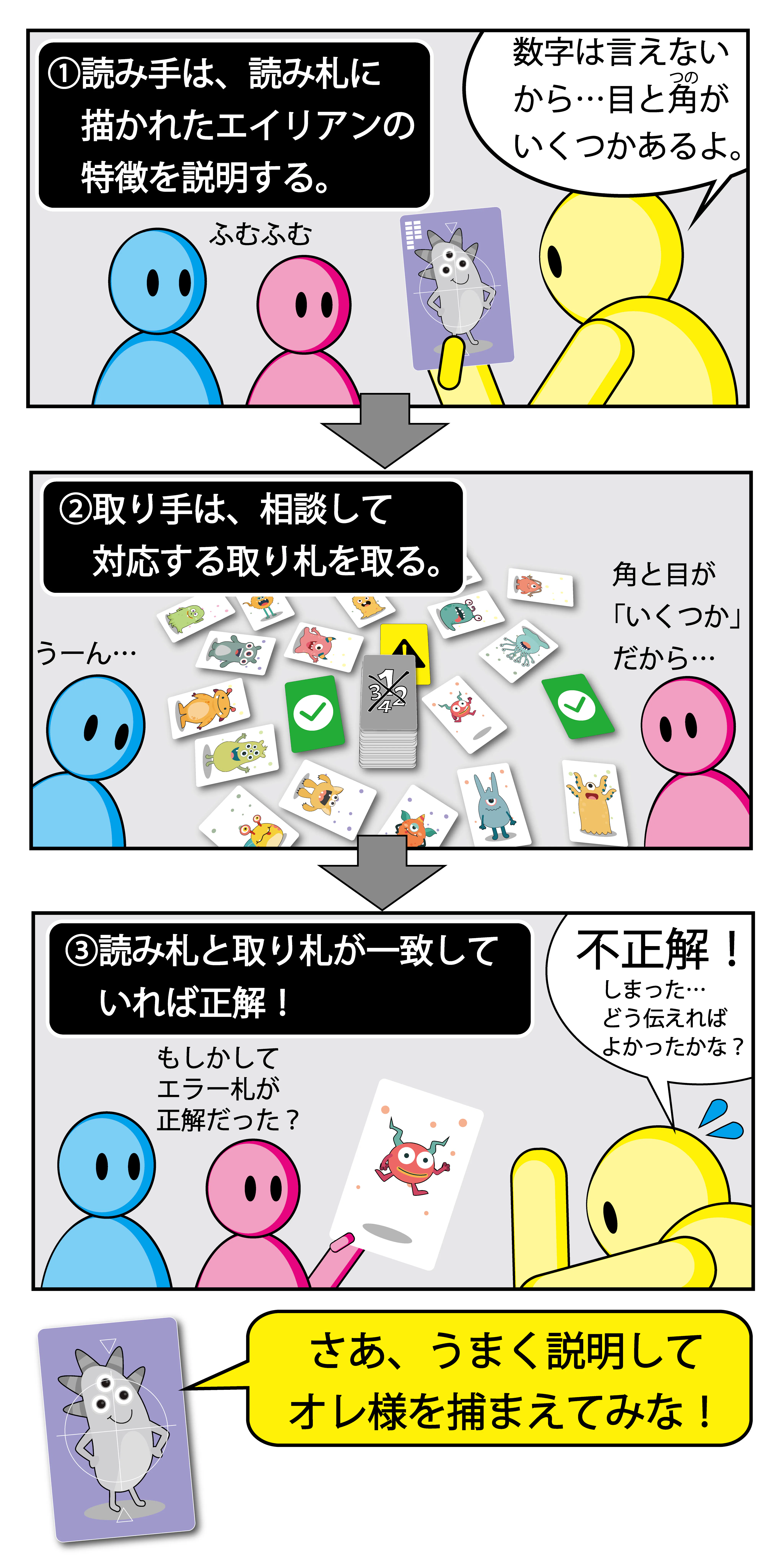 かるたのように、カードの読み手と取り手をそれぞれ分担します。皆さんは、地球の平和を守るスペースレンジャーとなり、役割を交代しながら、協力して悪いエイリアンを捕まえましょう。詳しくはマンガで!