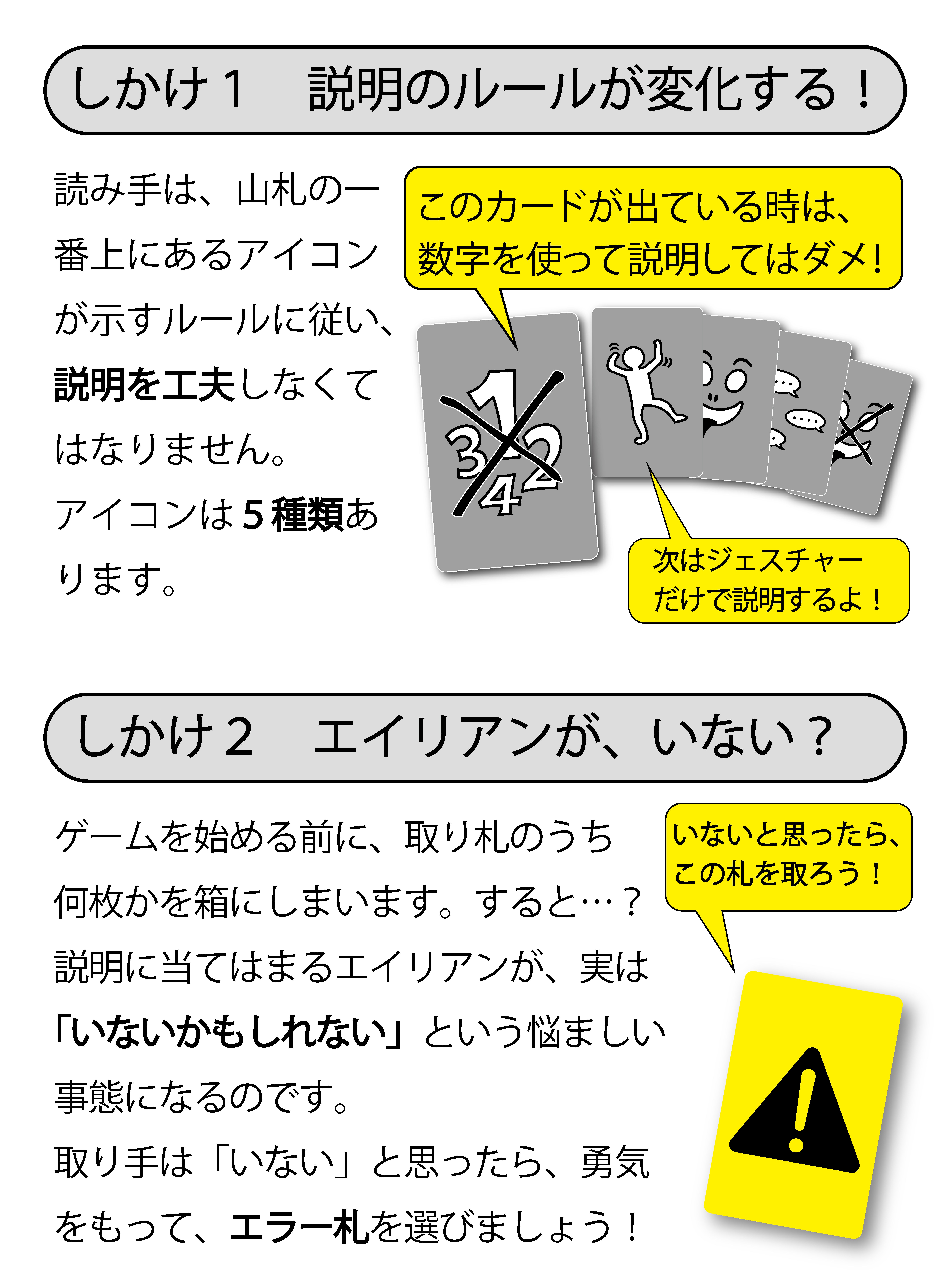 2回まちがえたらゲームオーバー。それまでに取ったカードの枚数によって、ゲームの結末が決まります。皆さんの表現力と想像力を結集させて、悪いエイリアンをどんどん捕まえましょう!