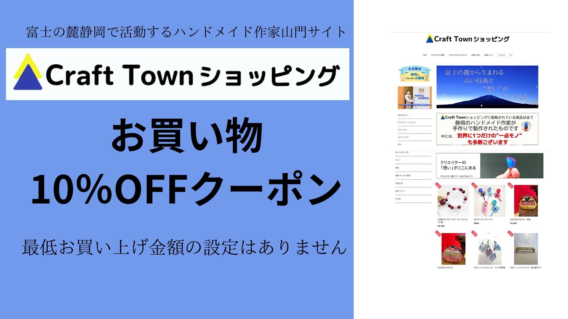ハンドメイド作家様へ、いつもよりお得な出品サービスと、一般の方向けには国内販売のCraftTownショッピングサイトでお得にご購入できるクーポンをご用意しております。