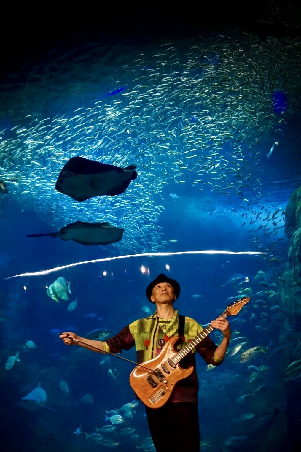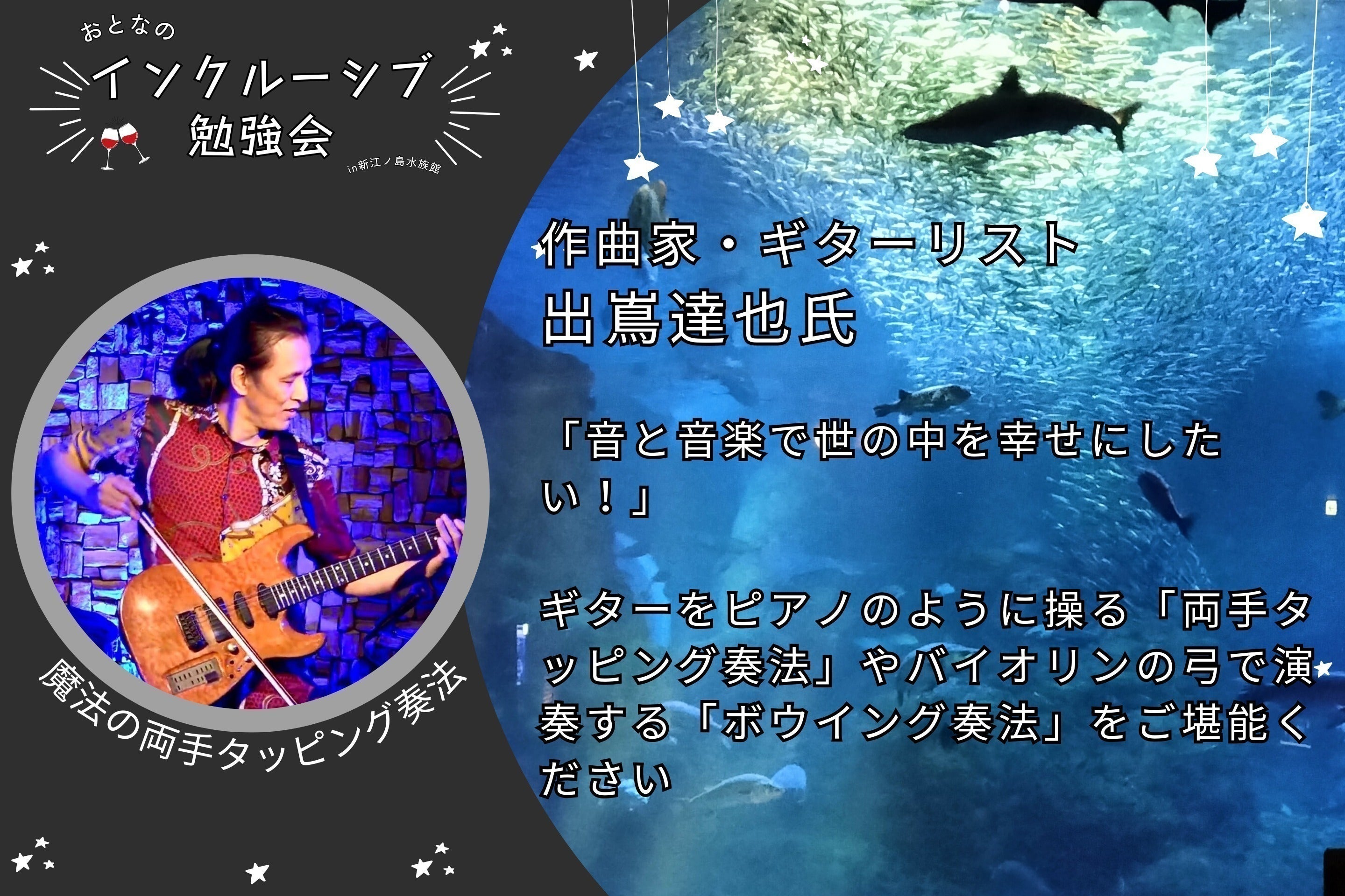 夜の水族館にピッタリ、作曲家・ギターリスト出嶌達也氏の「魔法の両手タッピング奏法」による幻想的な演奏、