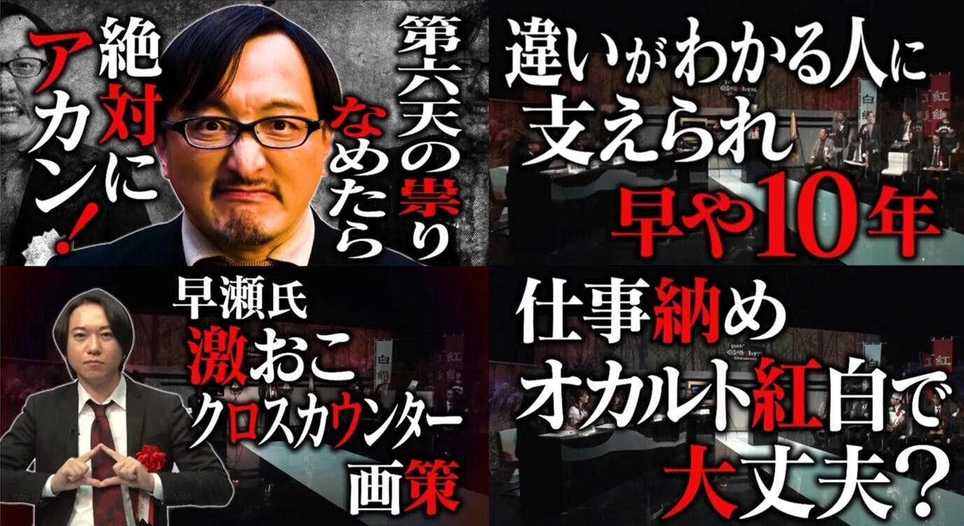 オカルト識者達が紅組・白組に分かれて、翌年に起こるであろうオカルト現象をプレゼン形式で披露。その内容の衝撃度で勝敗を決するというものです。2013年から始まってCSファミリー劇場の中では年末の風物詩として定着していました。