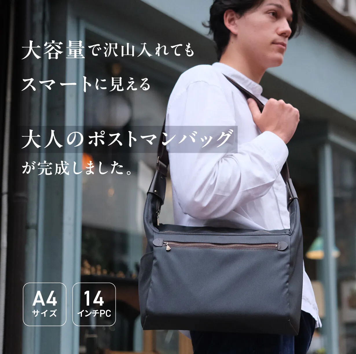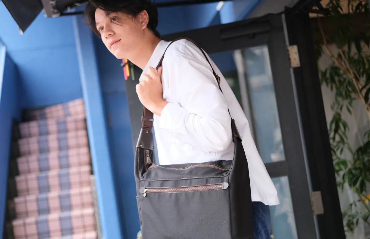 今回のポストマンバッグも、PCやタブレット類を持ち歩くのが当たり前になった時代にこの哲学に基づいてポケットを増やしてカバンサイズを大きくするのではなく"あえて削りスリム化することでシンプルさを際立出せるデザイン"をしました。
