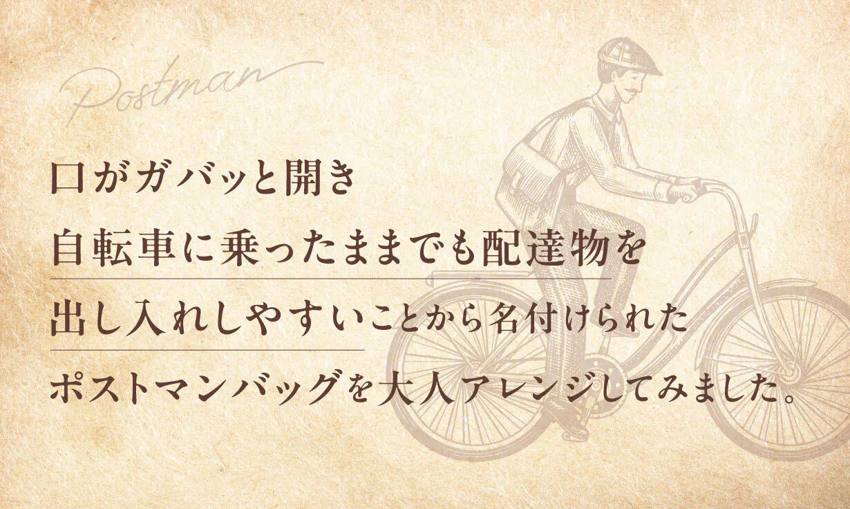 郵便配達員さんが使うカバンはポストマンバッグと呼ばれ、口がガバッと開き、バイクや自転車に乗ったままでも配達物が出し入れしやすい作りになっています。