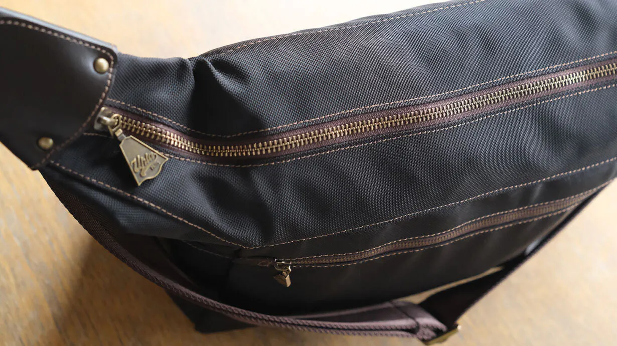 UPLAポストマンバッグではカバンの幅35cmに対して52cmのファスナーをラウンド状につけることで「ガバッと」間口が広がるので出し入れしやすくなっています。