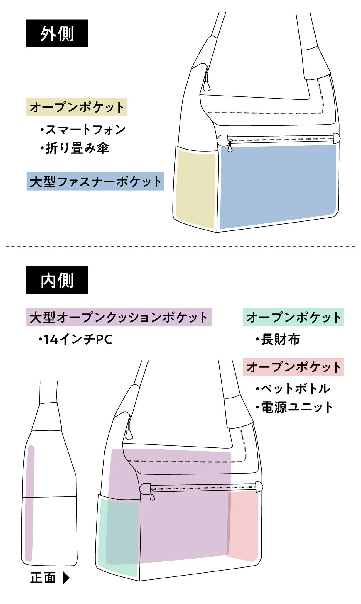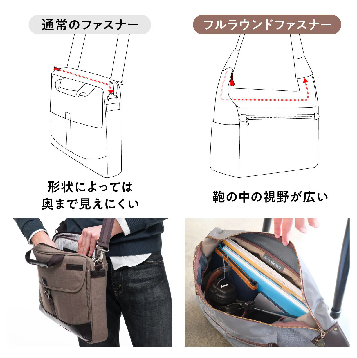 間口が広いからこそ「ファスナーを開けば一目で中が見渡せます」