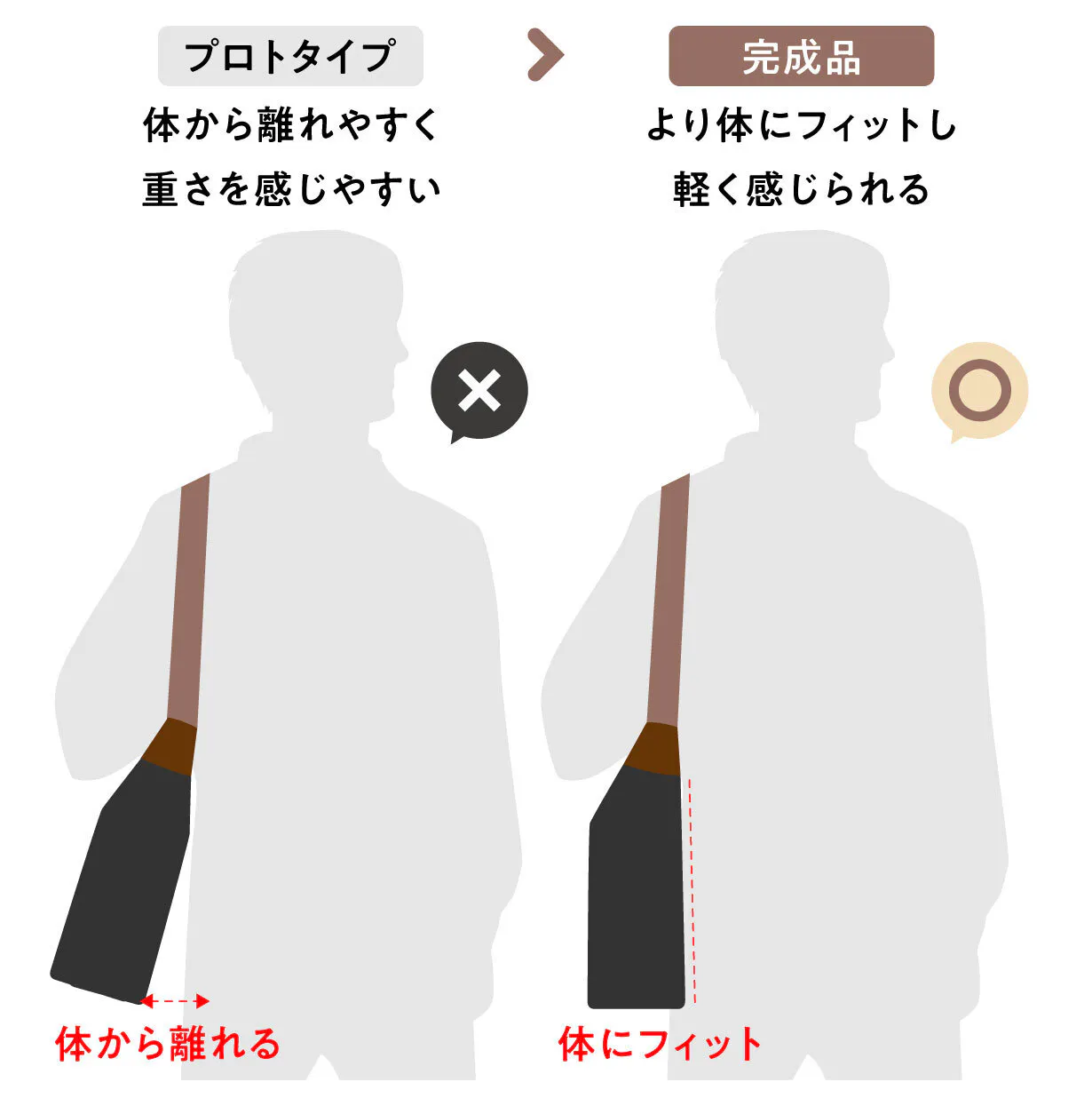 弊社従来品では重いPCをいれて肩にかけるとバッグが体から離れるようになっていましたが、パターン、縫い方を何回も試作することで解決しました。