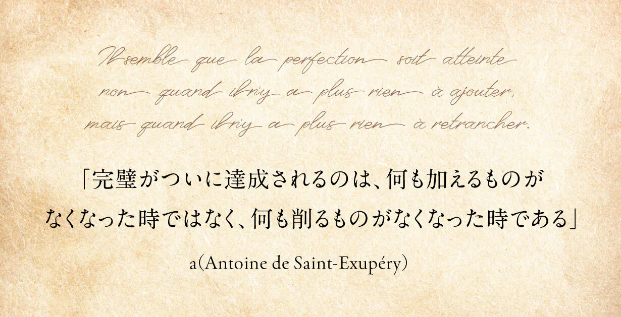 「完璧がついに達成されるのは、何も加えるものがなくなった時ではなく、何も削るものがなくなった時である」アントワーヌ・ド・サン=テグジュペリ(Antoine de Saint-Exupéry)