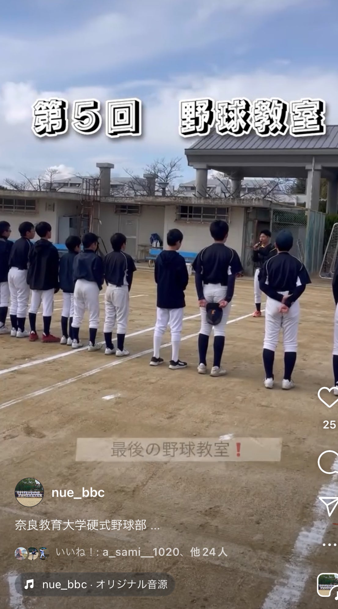 2024/07/31 09:13我々奈良教育大学硬式野球部は昨年中学生を対象とした野球教室を行いました。目的として、教育現場で課題となっている部活動の地域移行を進めていくために行いました。本年度はそれに続き、指導者派遣事業を行います。このように、少しでも中高生や指導者の方の力になれば良いなと思い活動しています。 もっと見る