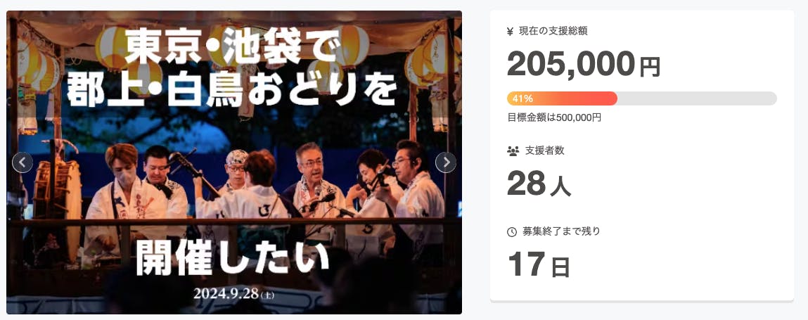 28人の方にご支援いただきまして、目標金額の41%まで到達しました。