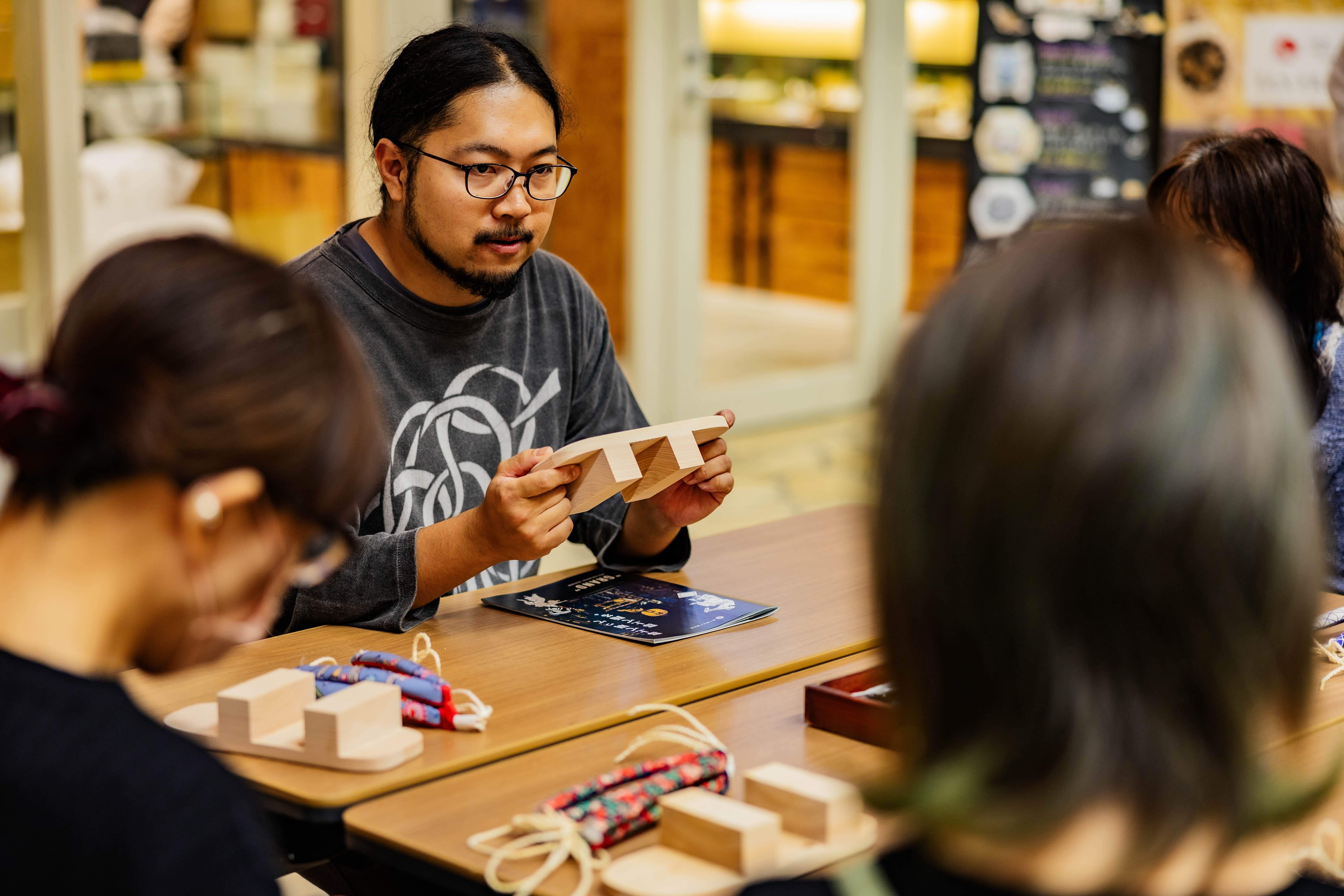 郡上発の下駄ブランド「郡上木履」の店主・諸橋氏のレクチャーによるワークショップです。好きな鼻緒を選んで、鼻緒の結び方が習えます。踊りの相棒となる踊り下駄を自分で作るので、愛着が半端ないです。