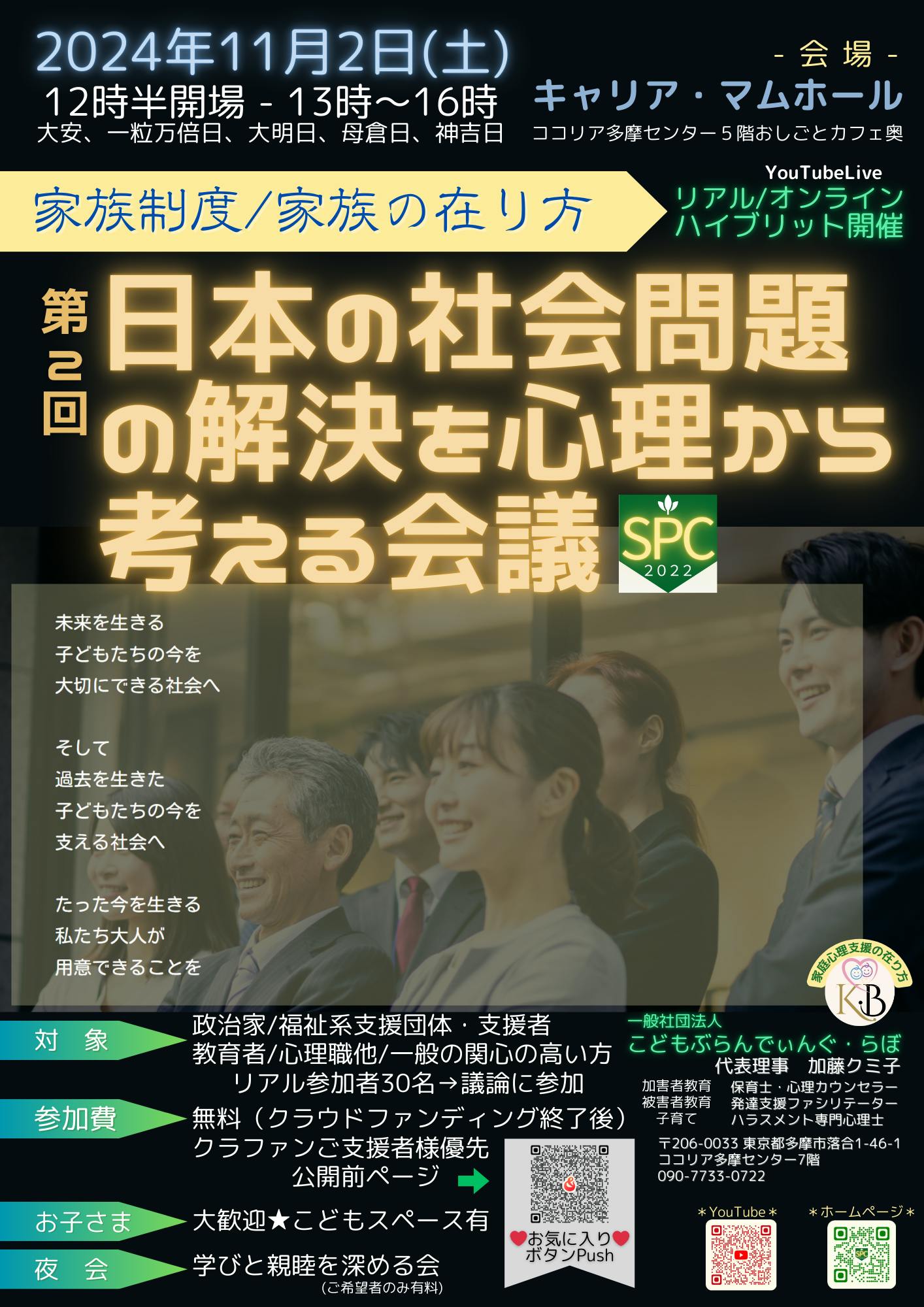 2024年11月2日(土) 京王多摩センター駅ココリア多摩センター5階キャリア・マムホールにて、講演会+ディスカッションイベント「第2回日本の社会問題の解決を心理から考える会議“SPC”」を開催いたします。