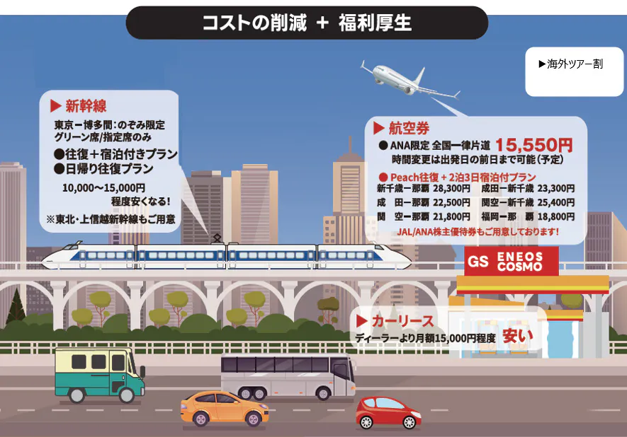さらに長距離路線バスも安くなるので、学生さんや帰省時の利用におすすめです。法人会員なら高速道路も最大40%割引に。