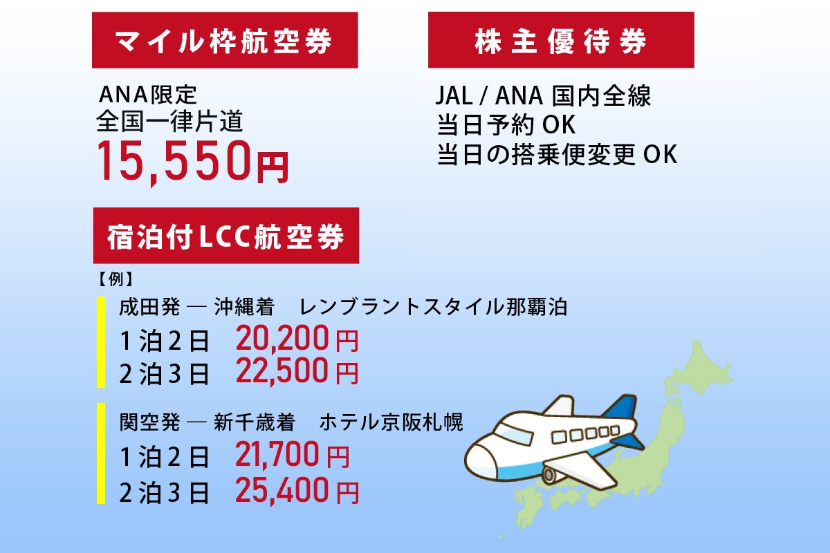 マイル航空券や株主優待券の他、LCC航空券ならホテル代がついてこのお値段です。株主優待付きの航空券なら、当日16時までに予約すれば90分後のフライトにも乗ることができ、急な予定変更にも対応可能です。