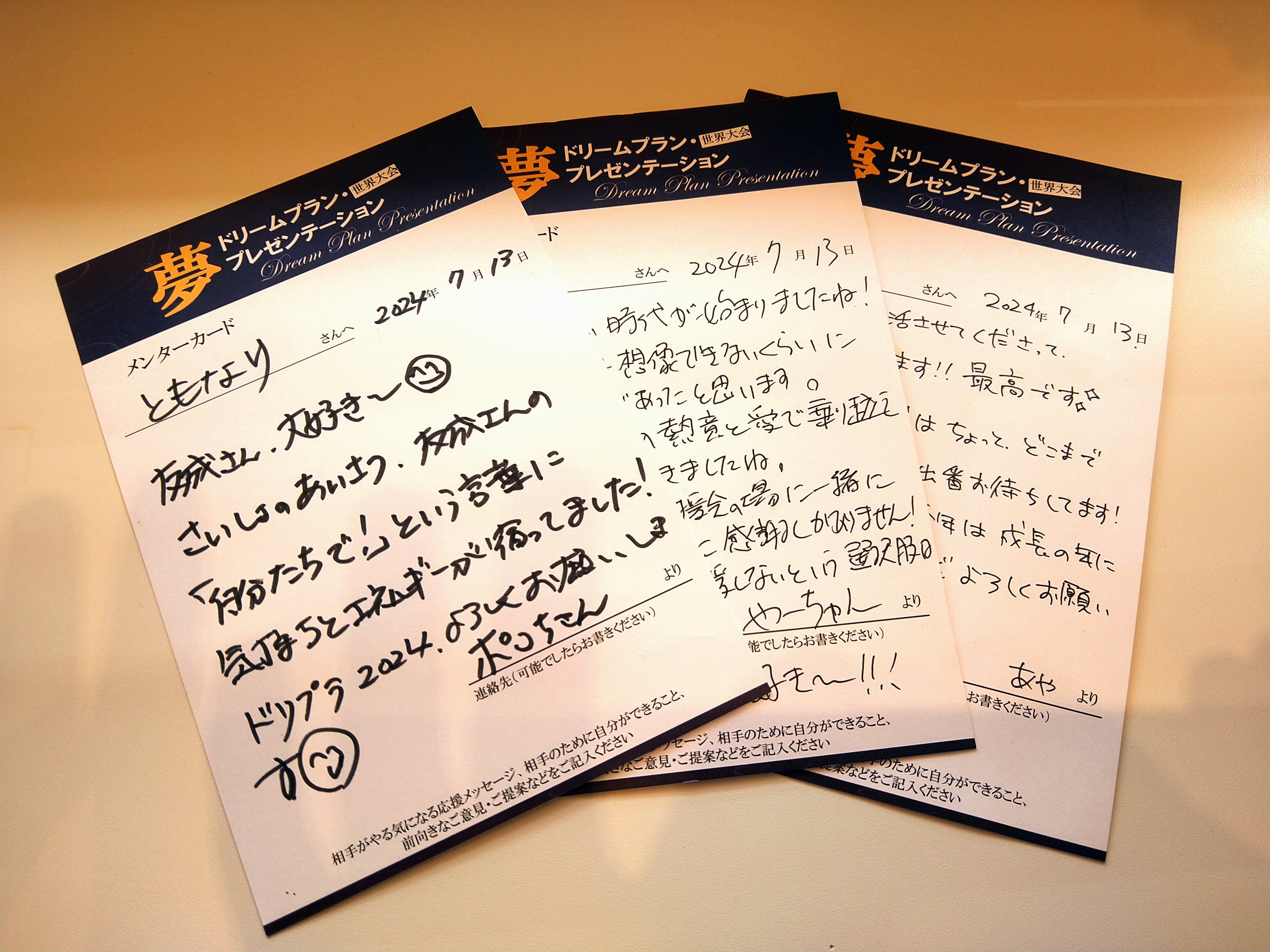 2024/12/09 11:09皆様へドリームプラン・プレゼンテーション世界大会2024~夢は自由の翼~昨日12月8日、最高、最幸な大会として終了することができました。最初に、受賞結果を発表いたします。■ 感動大賞 佐藤美帆 さん 「人生、うた謳歌♪プロジェクト 歌と言葉と仲間で理想の自分を取り戻す」■ 共感大賞野澤かなえ さん 「今ここを生きる 学び舎 笑未(えみ) だれもが私を大切にできる場所」創始者であり「通りすがりのもの」福島正伸先生が「新しい歴史がはじまった」とおっしゃるほどに、7名全員がすばらしいプレゼンテーションでした。関根智恵子さん 「愛ディア日本 あなたの愛が未来を創る」松田隆太さん 「「私の生きがい」が「会社の生きがい」になる! 自分にウソをつかない働き方」根本幸治さん 「生きる楽しみ縁結び!快縁隊 これでええがじゃ!今が日本の夜明けぜよ」鎌田めぐみさん 「太陽のめぐみセラピー 過去と向き合い ストレスの元を外し 自分らしく生きる」村田博さん 「大人の秘密基地ワクワクプロジェクト 若者がシニアになるのを楽しみに生きる社会をつくる」7名の最高のプレゼンターたち。皆様、これからもぜひともプレゼンターの応援をよろしくお願いいたします。大田えりさん、小澤綾子さん、安達充さんのスペシャルステージも感動の涙で溢れました。来場者全員への人生の応援歌。ドリプラ世界大会を祝福してくれたような素晴らしいステージを本当にありがとうございました。そして、昨日ご来場してくださった皆様これまでずっと応援してくださった皆様心より感謝申し上げます。「いいね、素敵だね」「応援してるよ」「頑張ってるね」「何かあれば言ってね」ひとつひとつの応援が、全てものすごい力になりました。皆様のおかげで、来場者が口々に「涙がとまらない」「素晴らしい大会」「本当に来てよかった」そう言っていただける大会なりました。小学生から大学生までの子供、学生もたくさん来場してくださいました。ある小学生のこどもは「本当に来てよかった」そんな感想も伝えてくれました。大人が本気で夢を語り、夢を応援しあう子どもたちに伝わったこと、本当にかかわってくださったり、応援してくださった大人の皆様のおかげです。次回に向けて、また開催日程が決まりましたらご連絡申し上げます。夢と勇気と笑顔にあふれた世界づくりこれからも一緒に、どうぞよろしくお願いいたします!――――――――――――――――――――――――ドリプラ世界大会2024 事務局一般社団法人ドリームプラン・プレゼンテーション世界大会 代表理事友成 治由 もっと見る