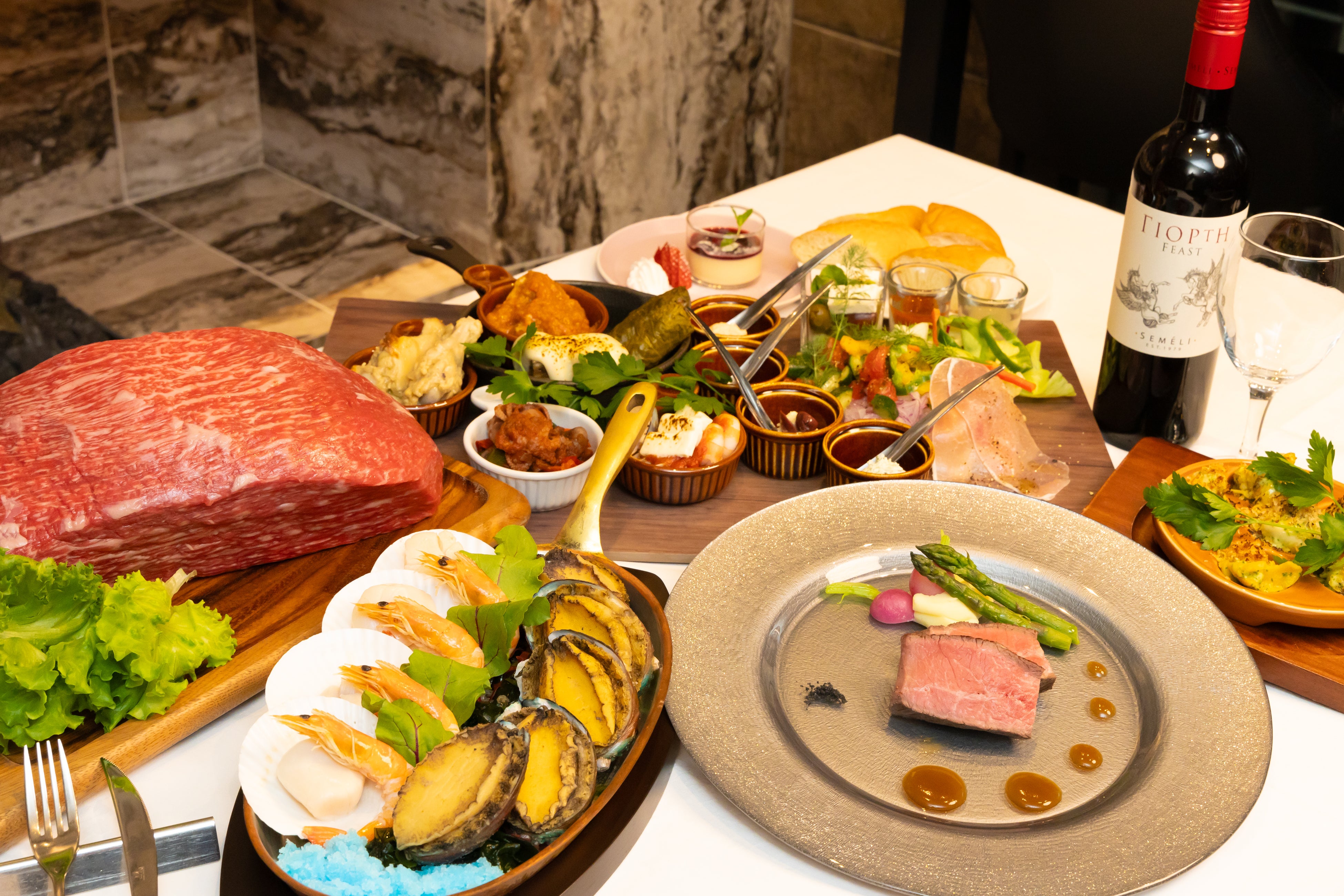 こちらはギオルティコースと言うお料理です。当ホテル自慢のギリシャ料理の前菜盛合せ、魚介料理にアワビやホタテ、エビのマリネ、つぶ貝のエスカルゴ風、メインのお料理には国産黒毛和牛のロースト、デザート・コーヒー・パンが付き、量、質とも十二分に楽しんでいただけるコース仕立てとなっております。(季節により内容が変わりますのでイメージとして御覧下さい)