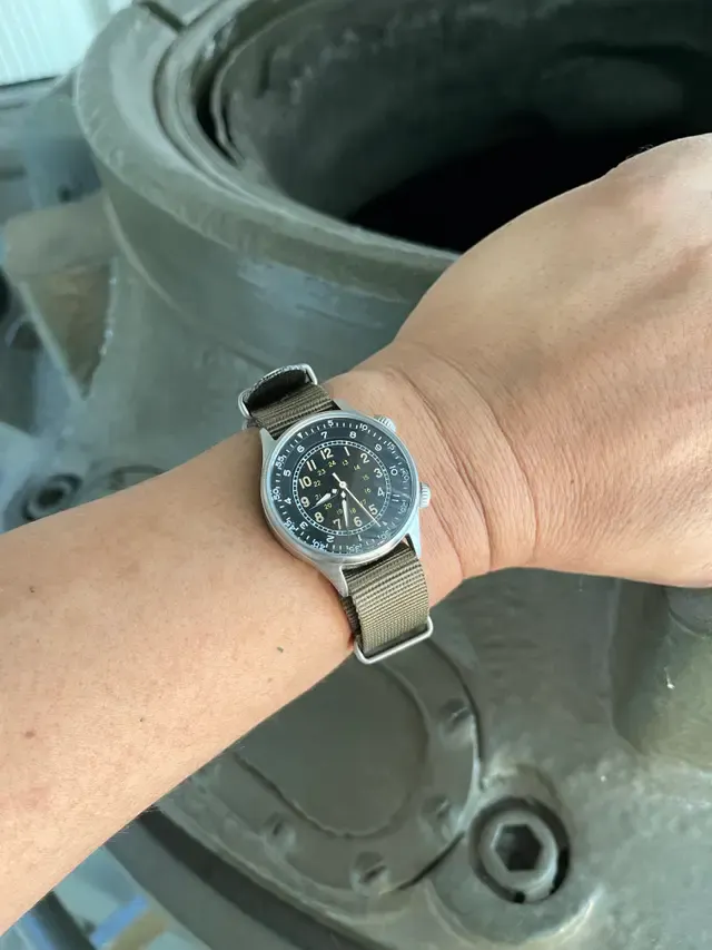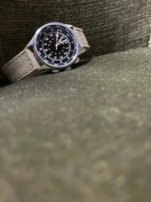 布製オリーブカラーストラップ当時のオリジナルで使われていた布製のストラップを再現いたしました。布製なので色が抜けてきますが、味わいのあるカーキ色に変色します。また糸も経年劣化によりほつれる場合があります事をご承知おきください。手首周り約15.25cm〜19.7cm。