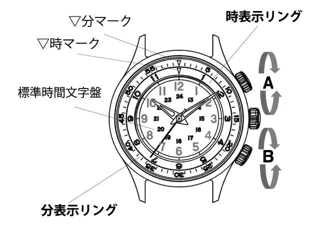自国の時刻は通常通り、内側の文字盤で見ます。ここでは説明しやすいように自国の現時刻を10時とします。-時計の短針が10、長針が12を指している状態-表示したい2カ国目の時差が+1時間であれば、リュウズBを回し”時アキュムレータダイヤル”の▼マークをマイナス1時間である9時に合わせます。同様に時差がマイナス5時間であればプラス5時間である3時に▼マークを合わせます。-時計の短針が3長針が12を指している状態-上記の場合分の時差がないので”分アキュムレータダイヤル”の▼マークは12時にポイントを合わせます。分の時差がある国は上記の同様に分差分をプラスマイナス逆にしてリュウズAを回し”分アキュムレータダイヤル”の▼マークを合わせてください。