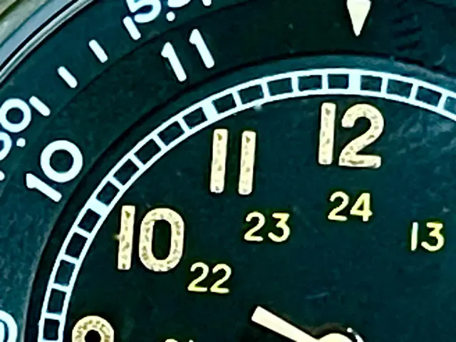 前記の様にTYPE A-11に足りなかった面を改良する為に製作されたTYPE A-15は 12時間表示及び24時間表示部分と針が夜行塗料にて製作されました。その為、現存するオリジナルの文字盤のインデックス部分は黄色、オレンジ、茶色に変色しています。そのヴィンテージ感を敢えて再現させていただきました。弊社独自のヴィンテージ加工や剥離塗装を施しています。但し色目を出す為の加工なので、長時間直射日光に当てての蓄光機能になる上、蓄光効果は低めです。蓄光機能を期待してのご購入はおすすめ致しません。これからの弊社の課題として研究を続けさせていただいております。