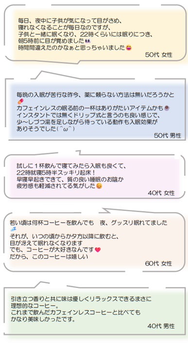 日本中、いや世界中のコーヒー愛飲者が睡眠前でも安心して飲める、良質な睡眠のためのコーヒーです。