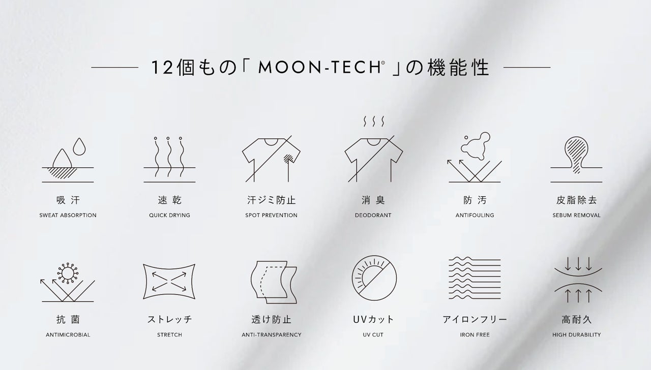 「MOON-TECH®」は、JAXA(国立研究開発法人宇宙航空研究開発機構)と東レが共同開発した宇宙技術を搭載した最新の先端素材です。 東レの「フィールドセンサー®EX」素材をベースに、長期間の閉鎖された環境である宇宙ステーションでの快適な生活のために開発された「宇宙技術」も含む、高レベルな12個もの機能を搭載した「過剰なほどの機能性」を持ちます。