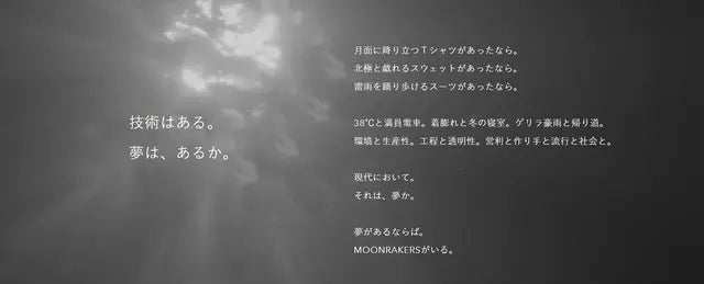 加えて、当プロジェクトは単独では成りたたず、東レ、JAXA、小松マテーレなど多数の生産協力企業はもちろんのこと、実際に商品を使用いただくユーザーのみなさまも含めた「挑戦の想いに共感いただく世界中のすべての人々との共創」で初めて成り立つことを忘れないために、末尾に複数形の「S」を加えた「MOONRAKERS(ムーンレイカーズ)」としています。