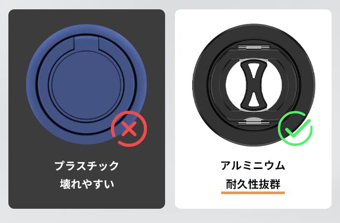 従来モデルは、プラスチックを多用していたため、使い込むうちに割れたり緩んだりしやすいです。本製品は、回転軸の周りにアルミニウムを採用、圧倒的な耐久性と強度を実現されます。